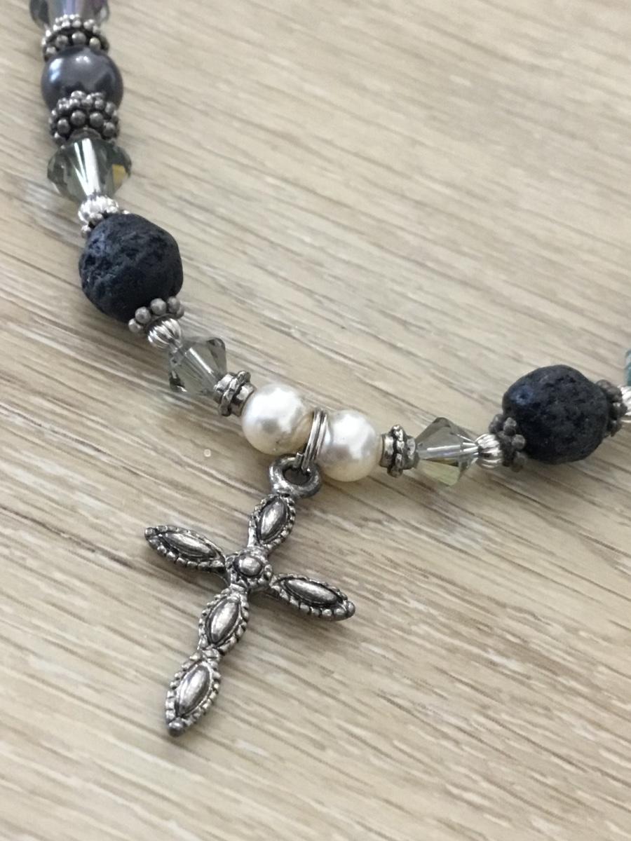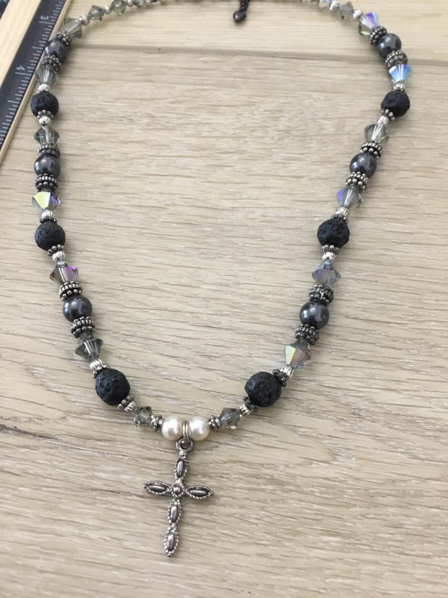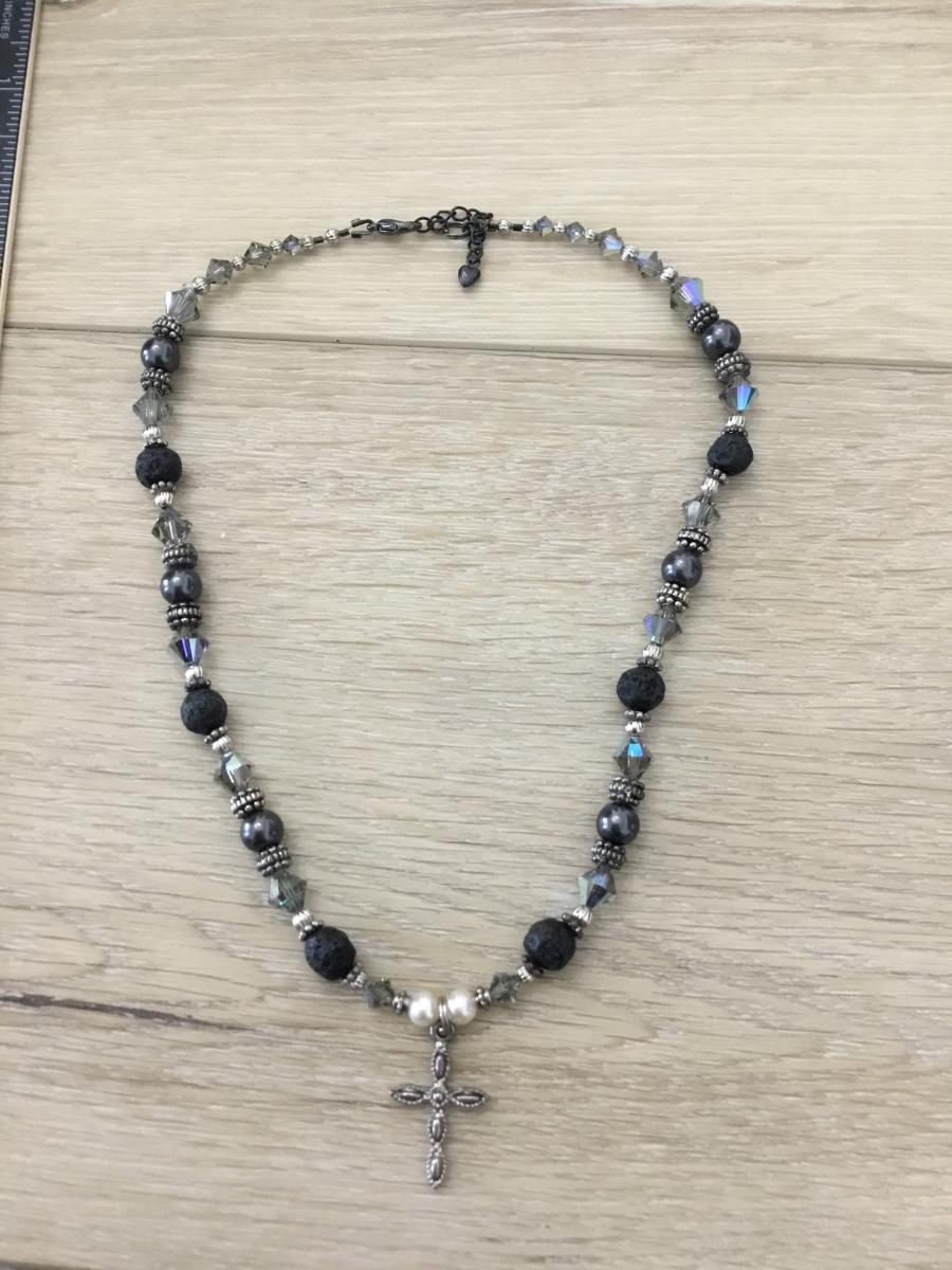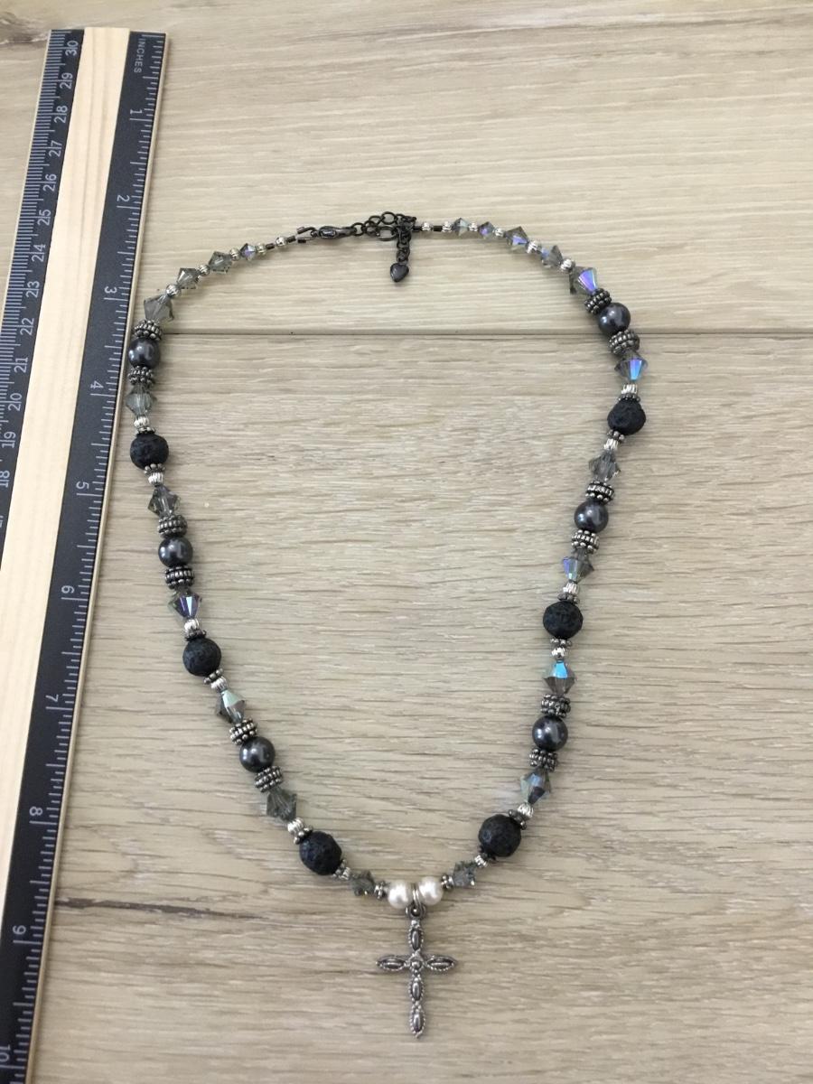 Silver tone cross pendant beaded statement necklace