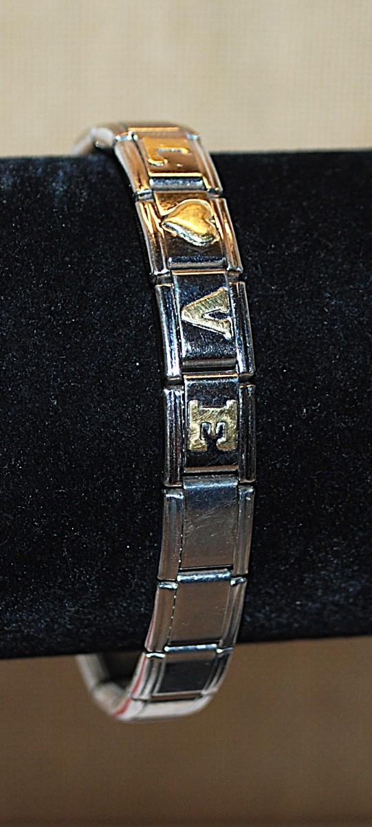 Silver Tone Elastic "LOVE' BRACELET (2¼" Opening) - Marked "ADD-A-CHARM ©" with Gold Colored Letters "Love"