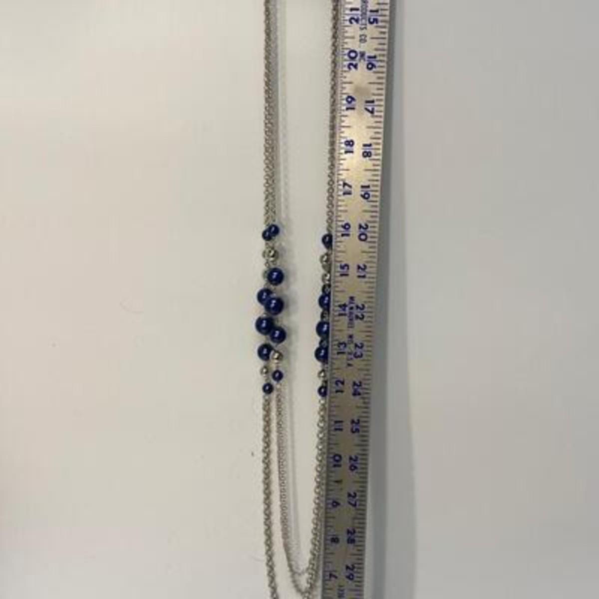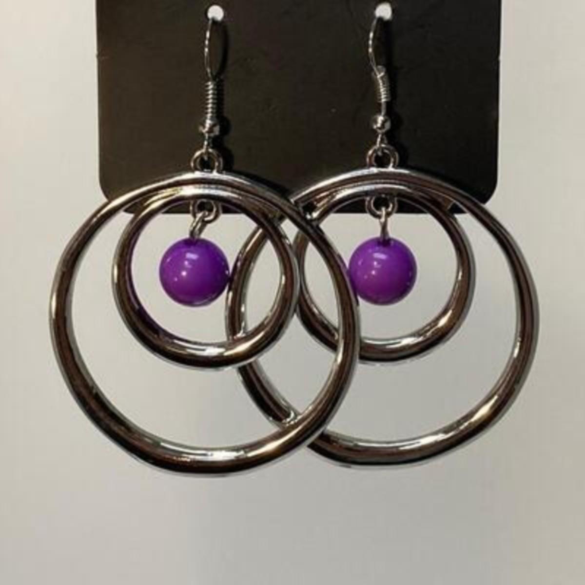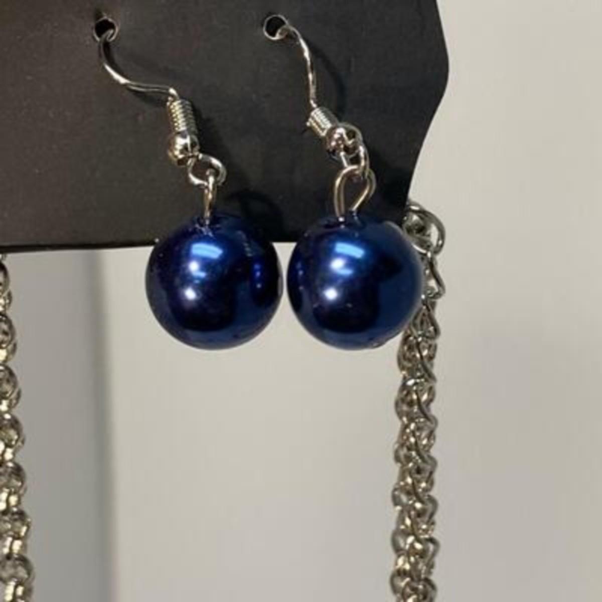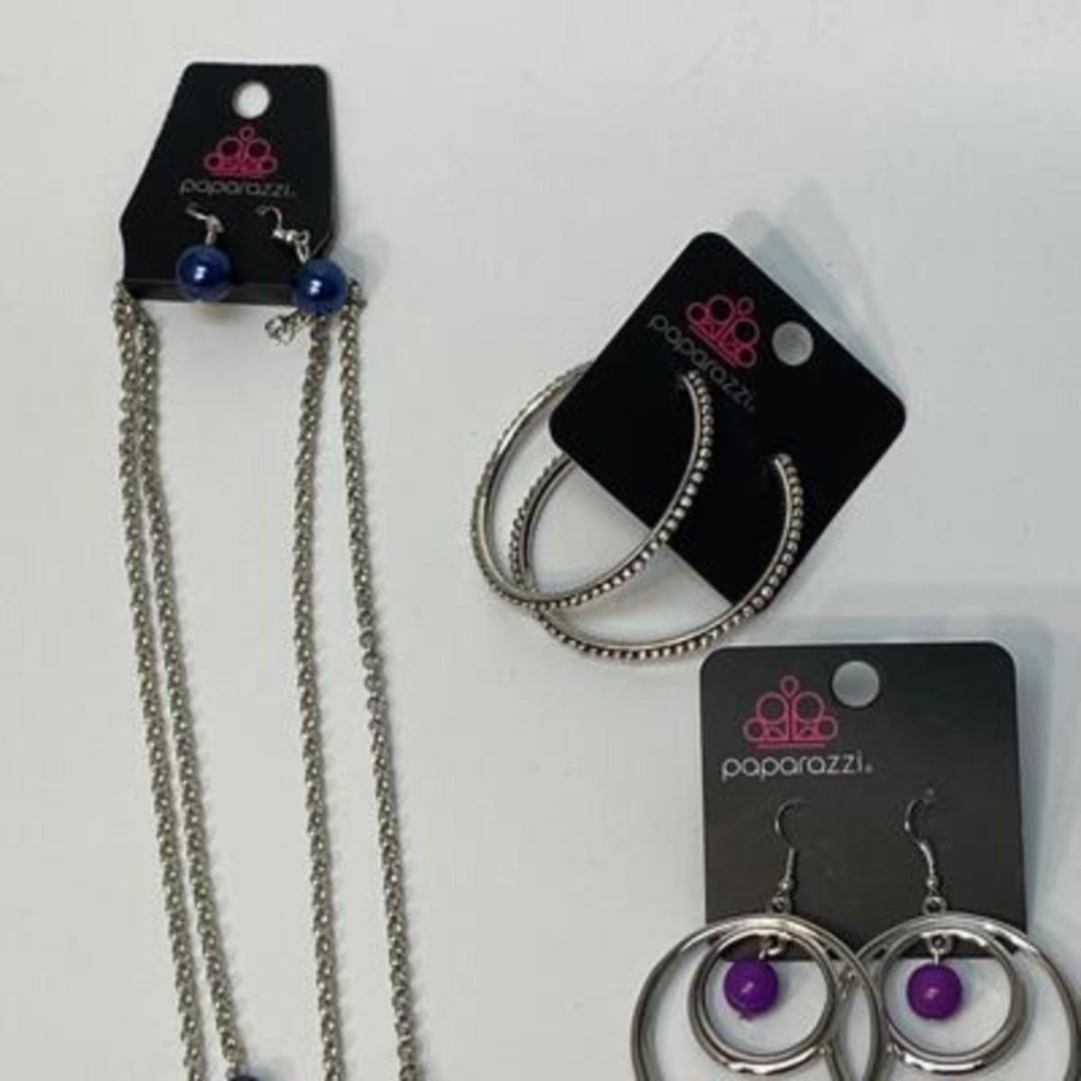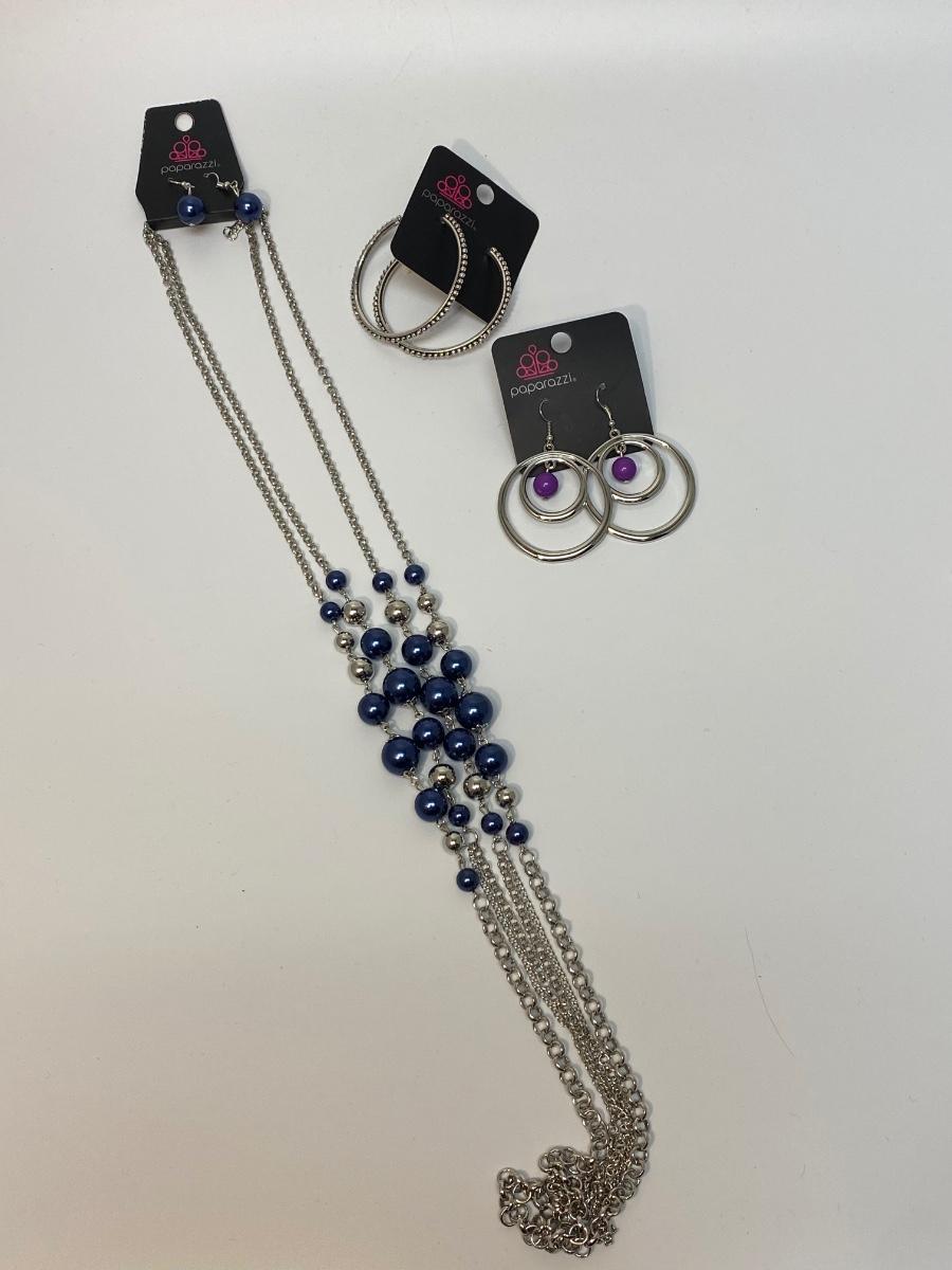 Silver tone fashion jewelry. Two pairs of earrings and an extra-long necklace. Necklace has a matching pair of small dangle earrings included. All pieces are on original hang cards.