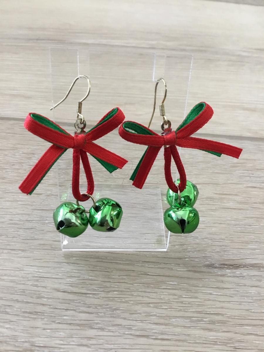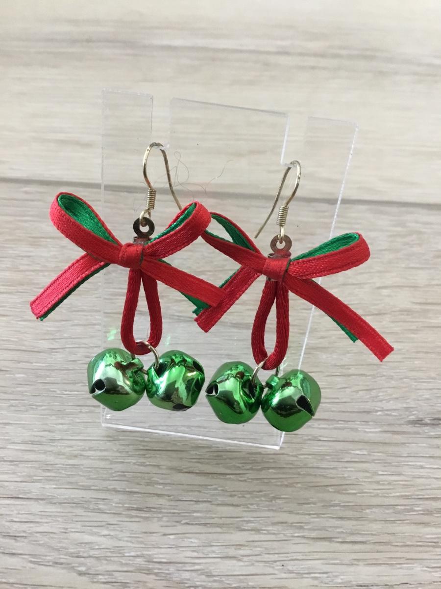 Silver tone green bell bow earrings
