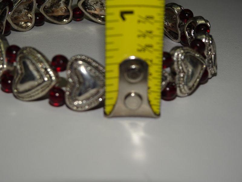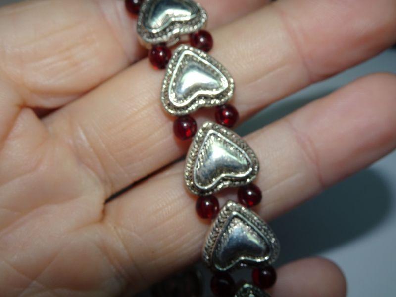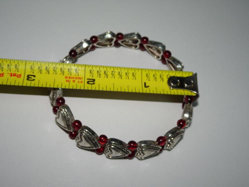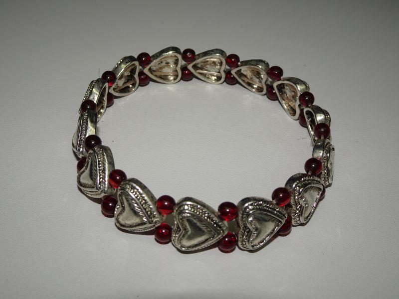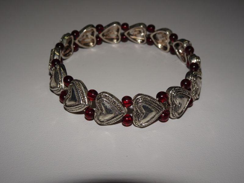 Silver Tone Heart Stretch Bracelet, Red Beads