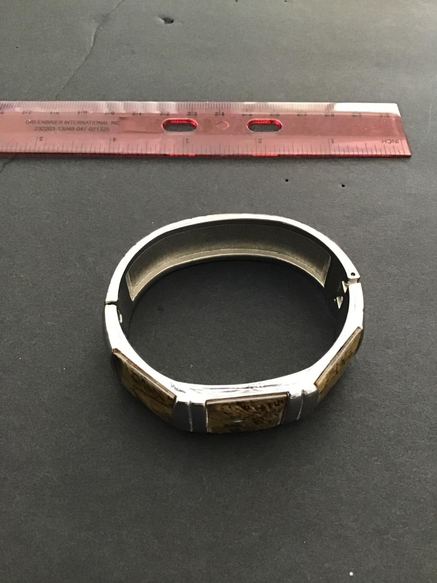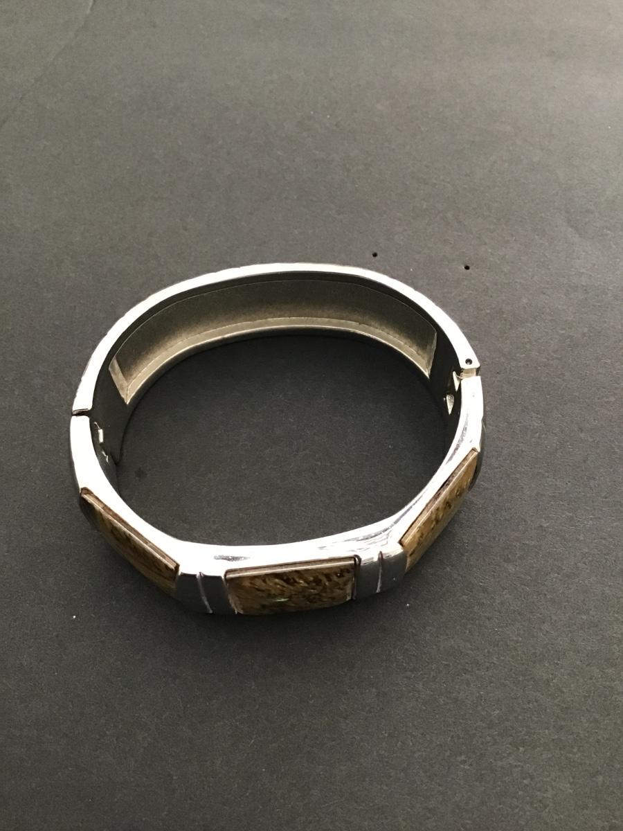 Silvertone hinged bangle bracelet with honey Baltic amber inserts. Please see attached photos.