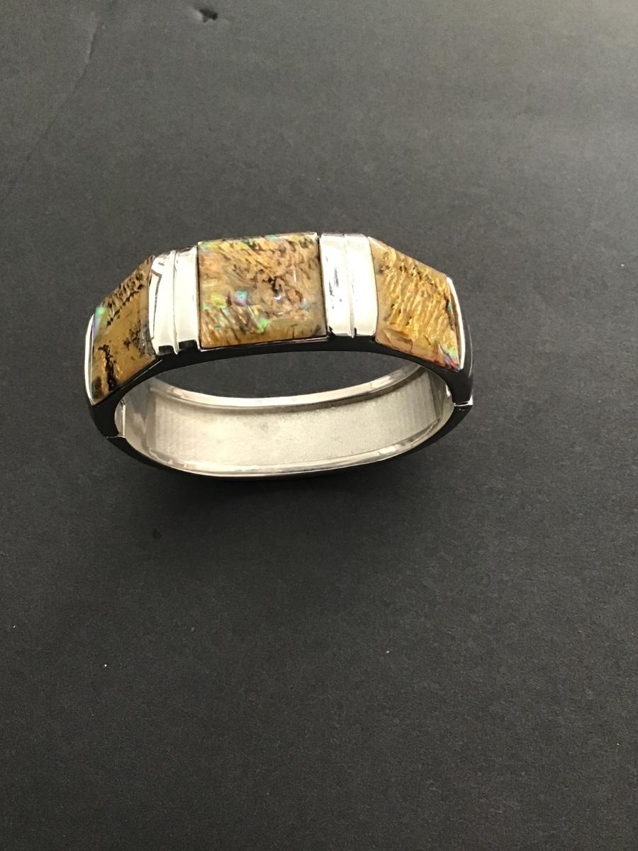 Silver tone, hinged bangle bracelet with Baltic amber inserts