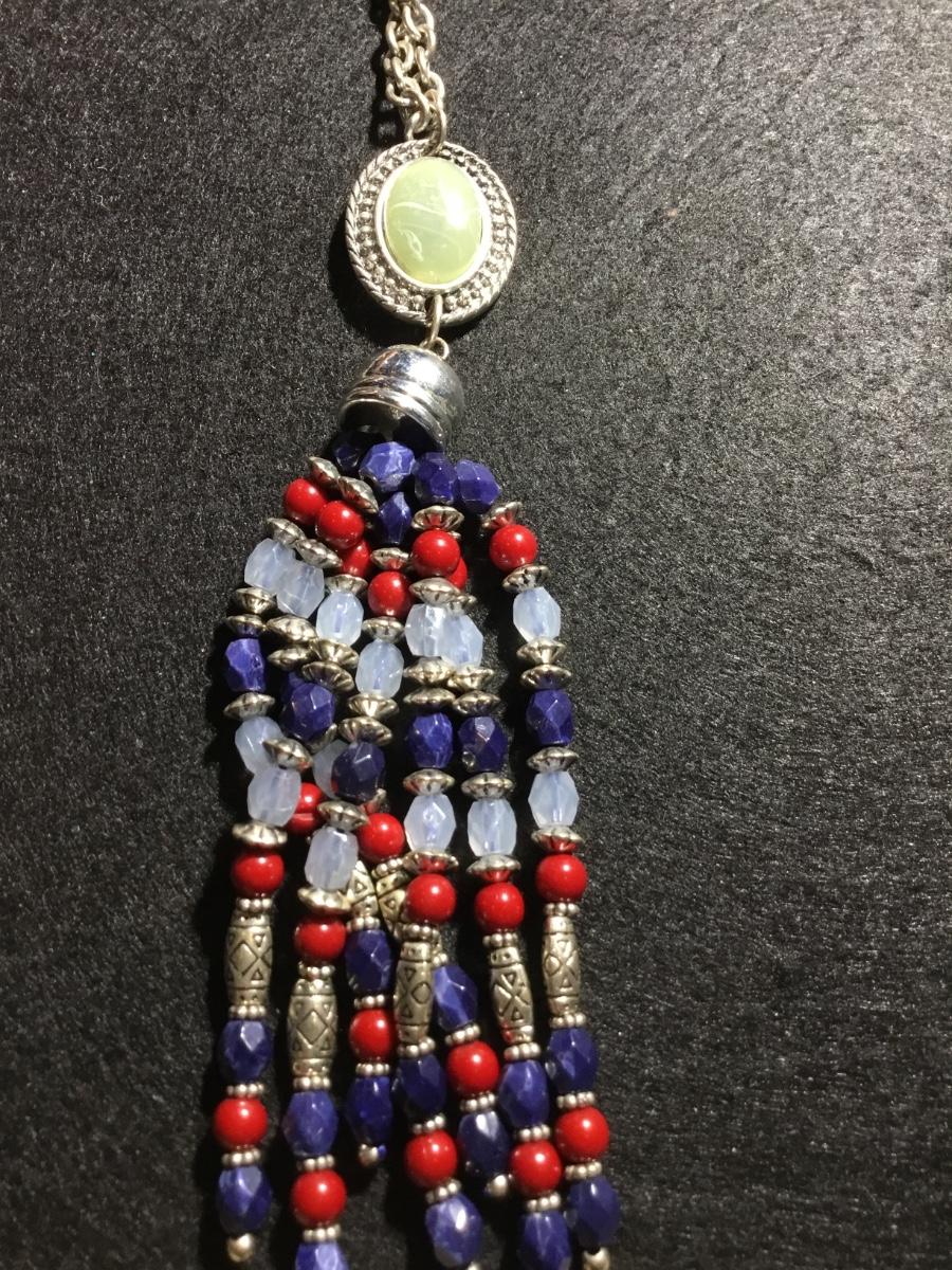 Silver tone long colorful tassel beaded faux stone type statement necklace