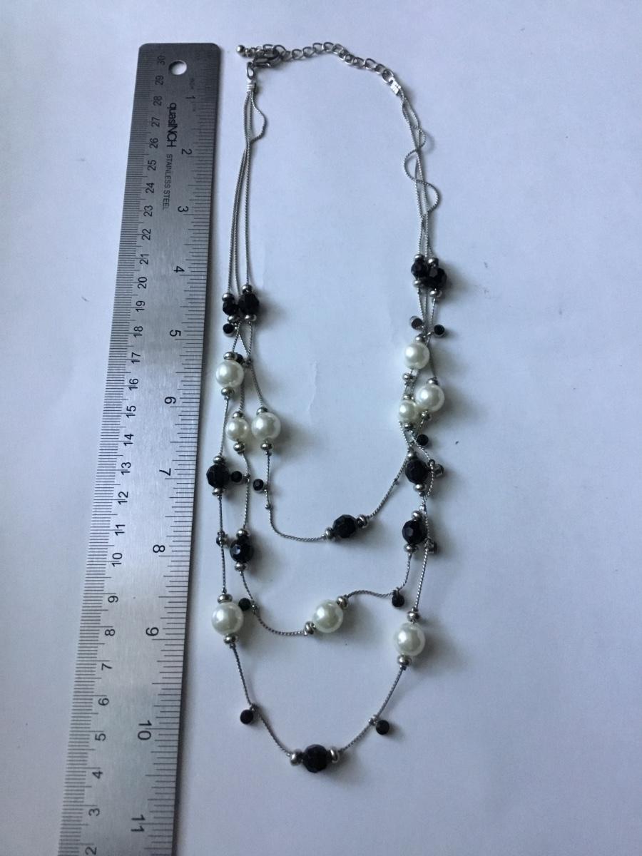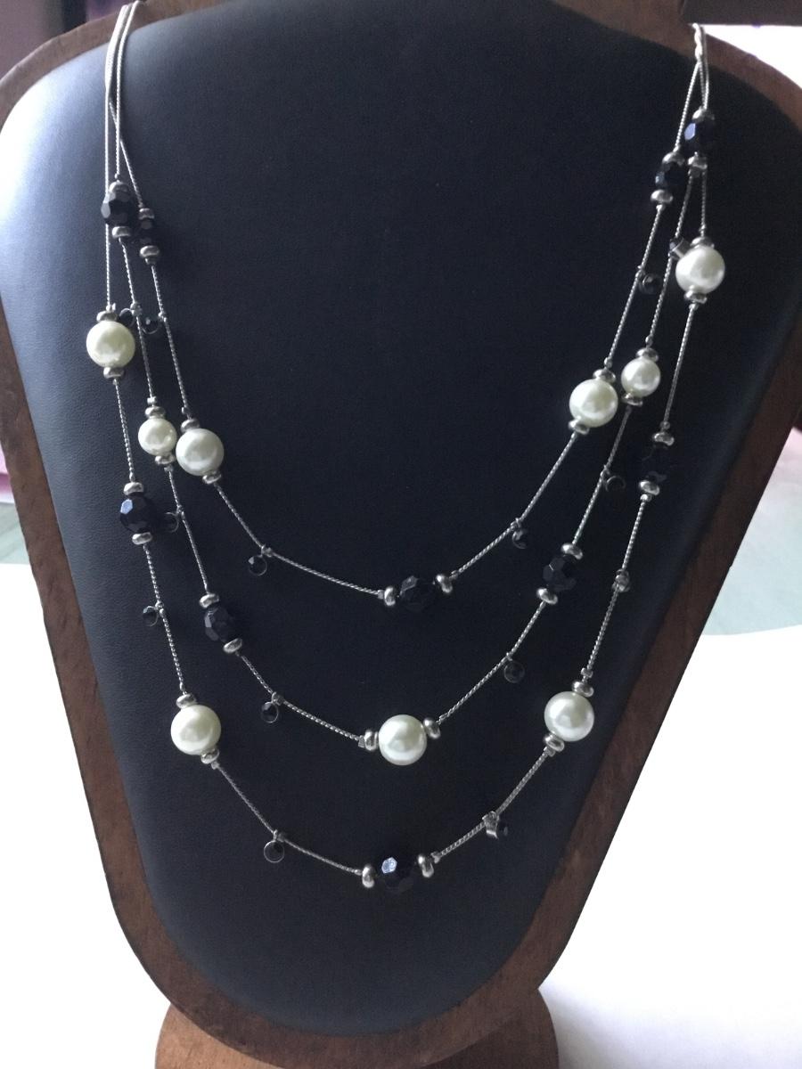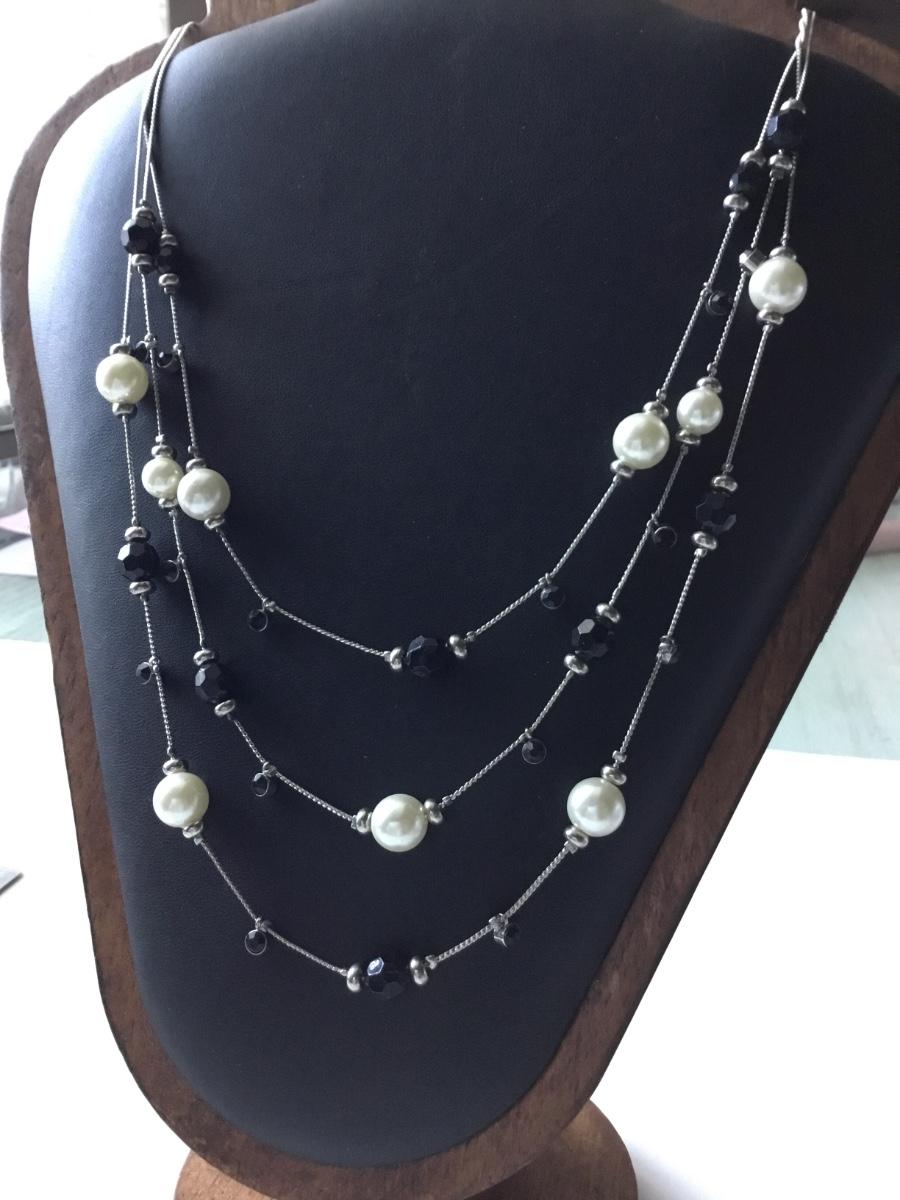 Silver tone multi strand faux pearls black acrylic beads necklace