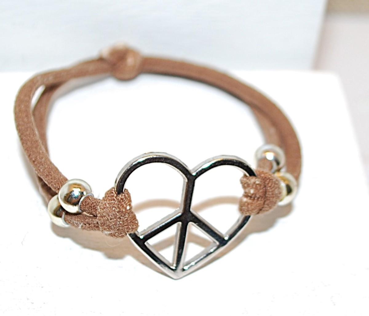 Silver Tone Peace HEART (1" x ¾") Bracelet with Brown Cloth Expandible Tie 2½" to 4"