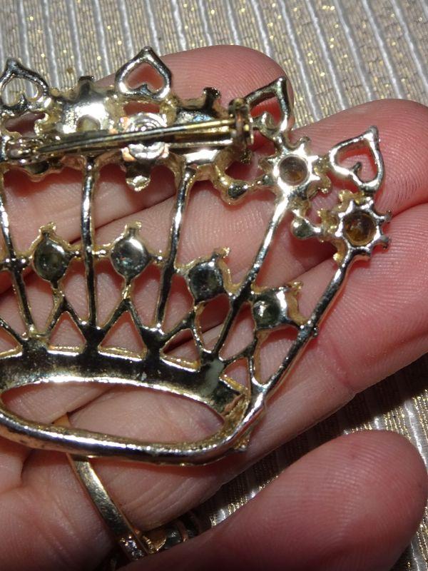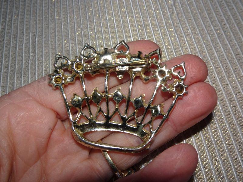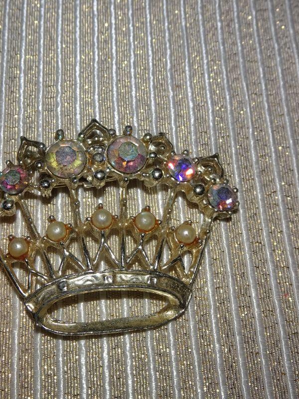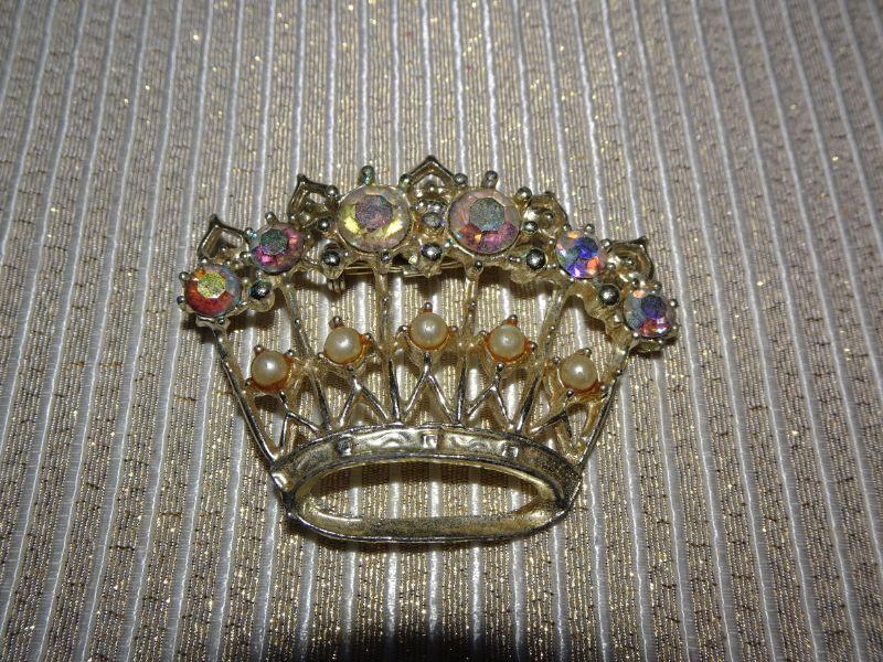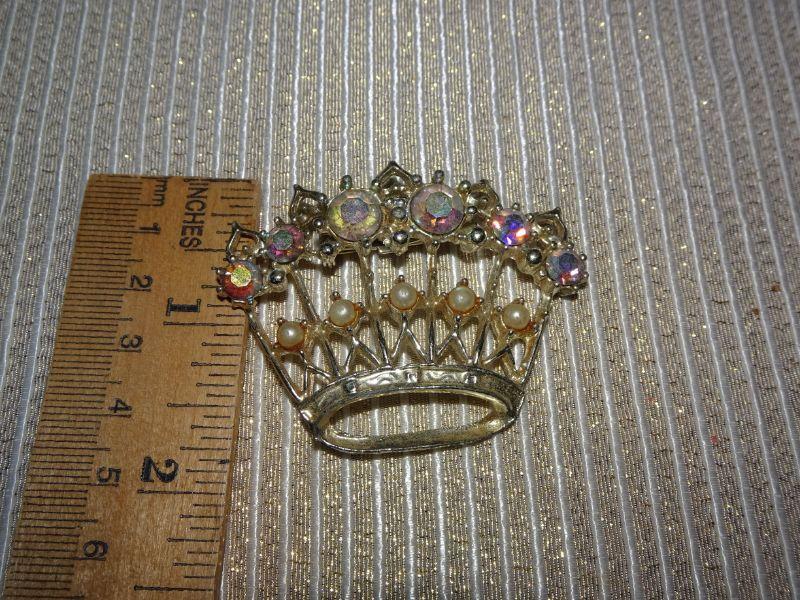 Silver Tone Pearl & Aurora Borealis Rhinestone Royal Crown Brooch