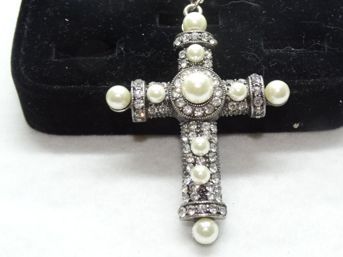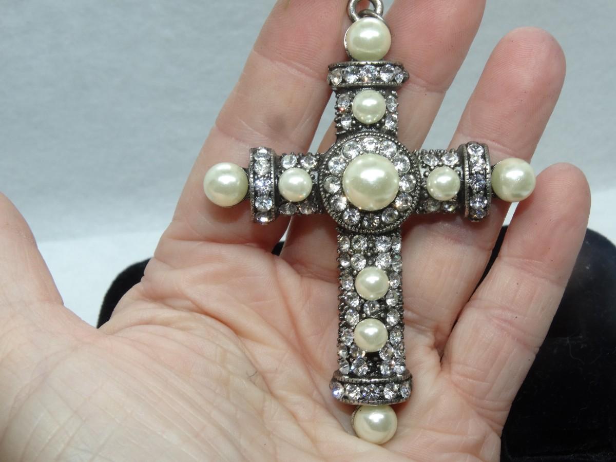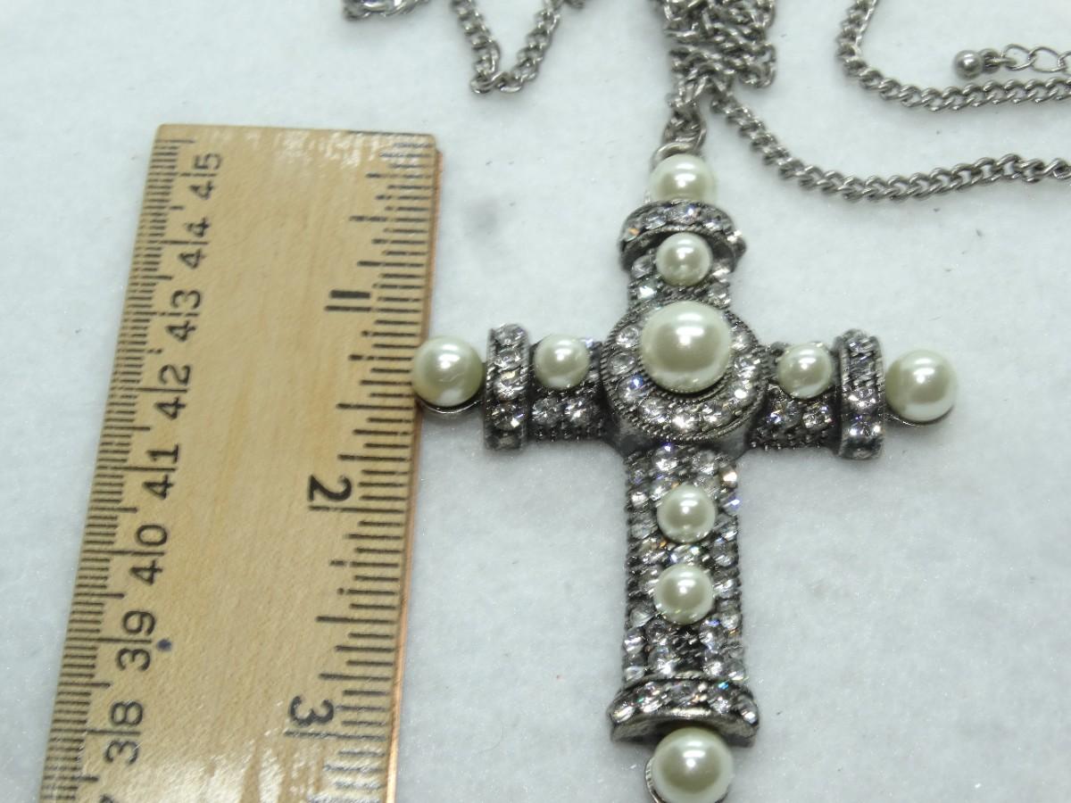 Silver Tone Pearls & Rhinestone Cross Pendant, Beautiful!