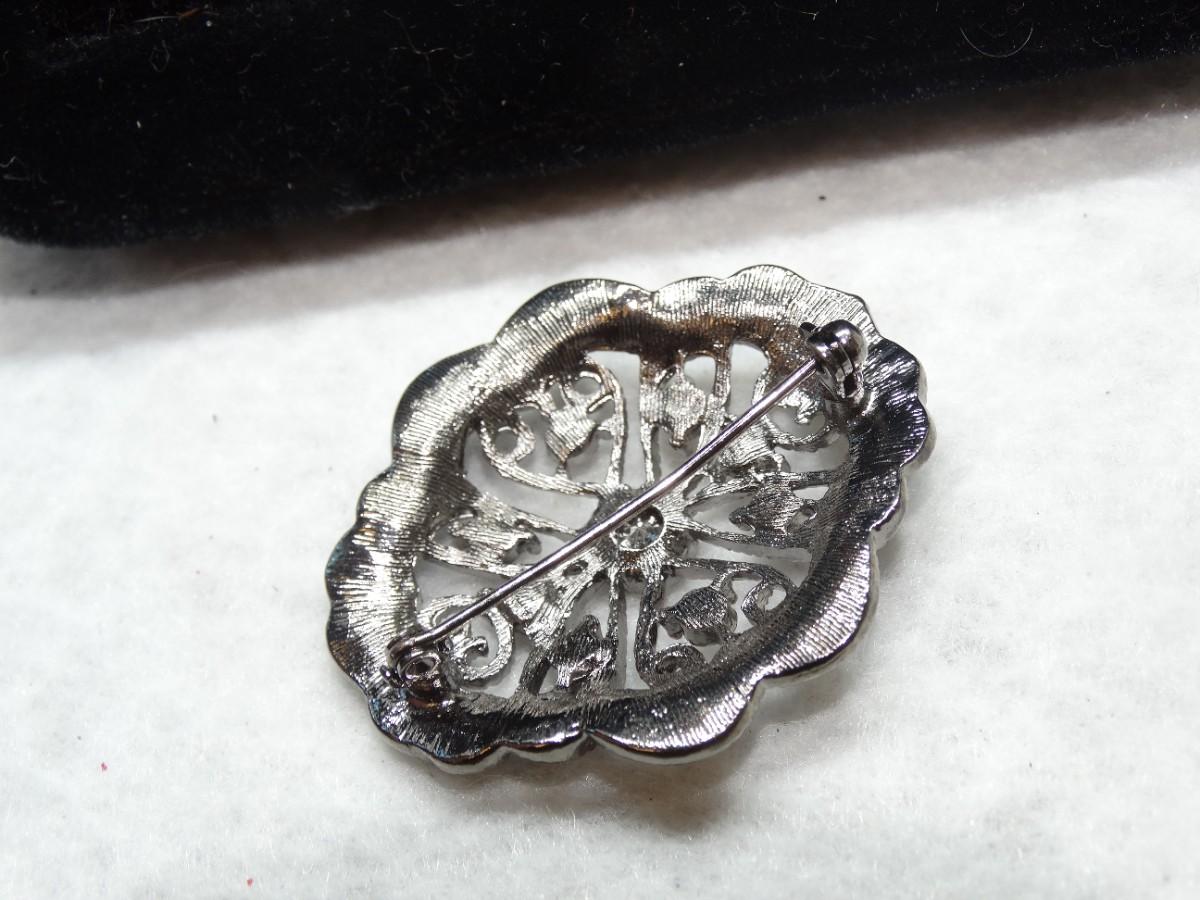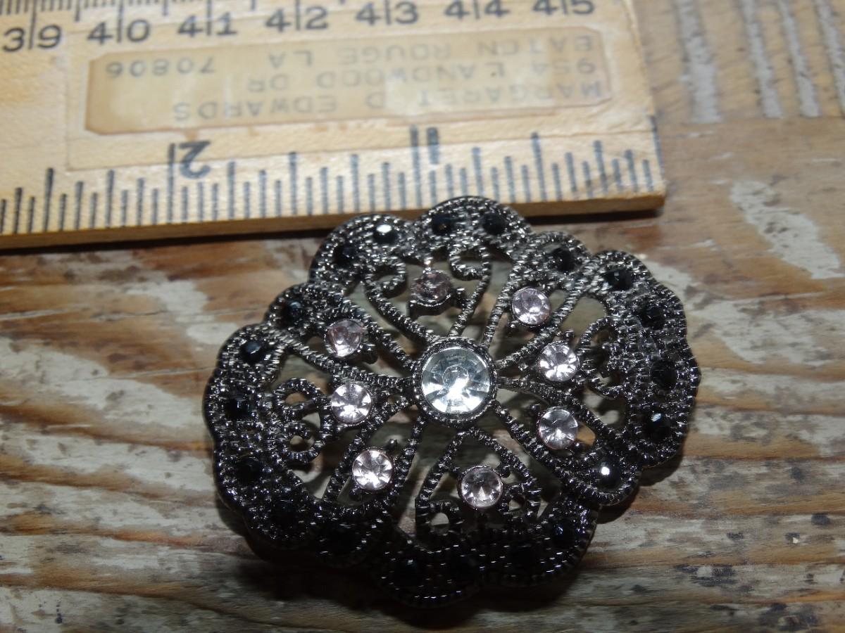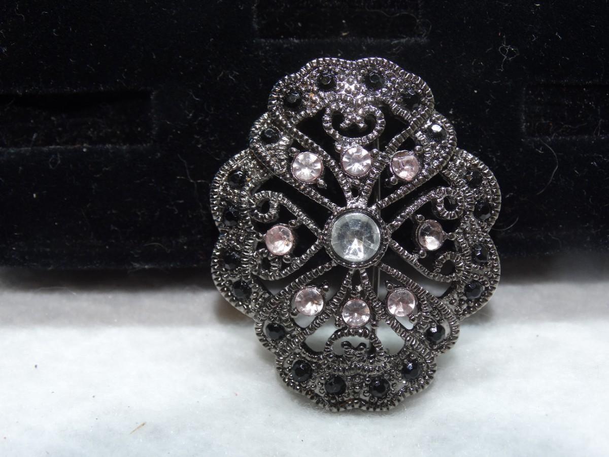 Silver Tone & Pink Rhinestone Brooch, Victorian Filigree