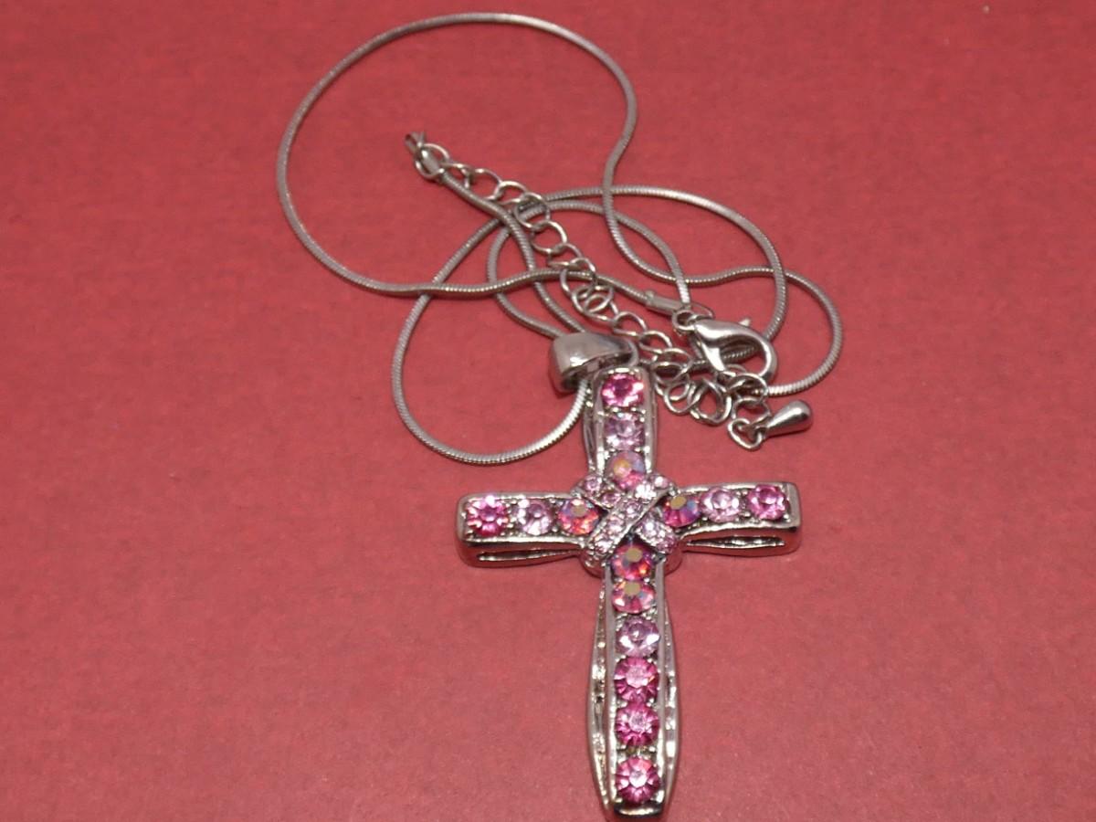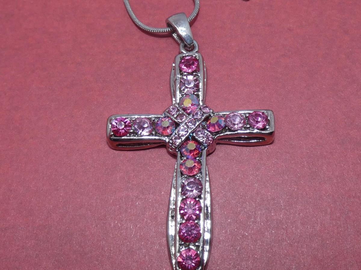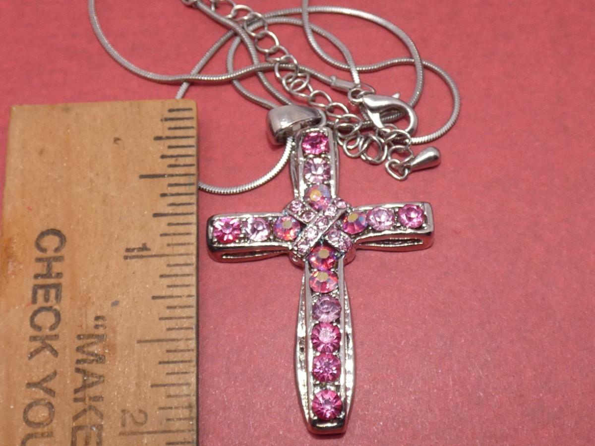 Silver Tone Pink Rhinestone Pendant Cross Necklace