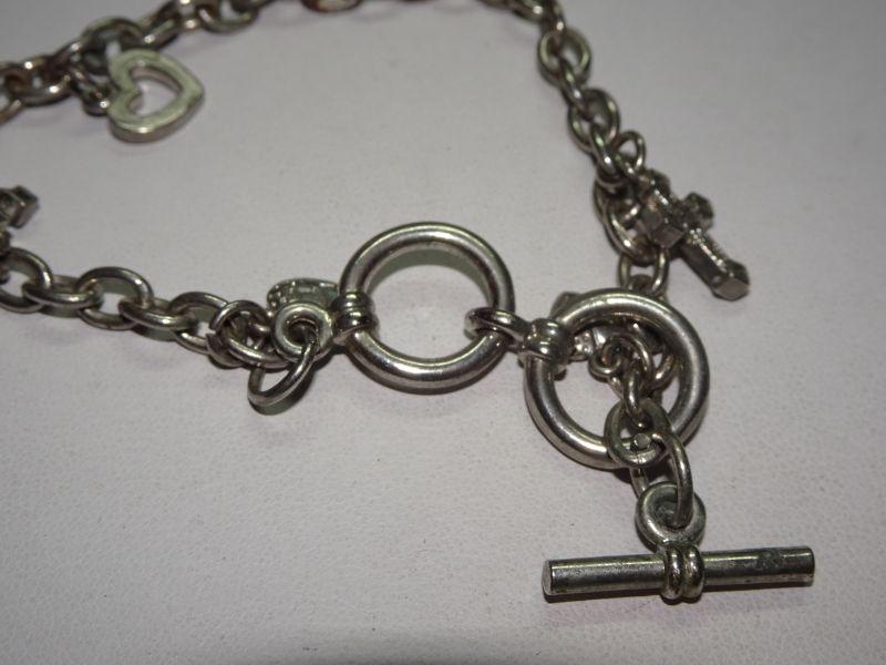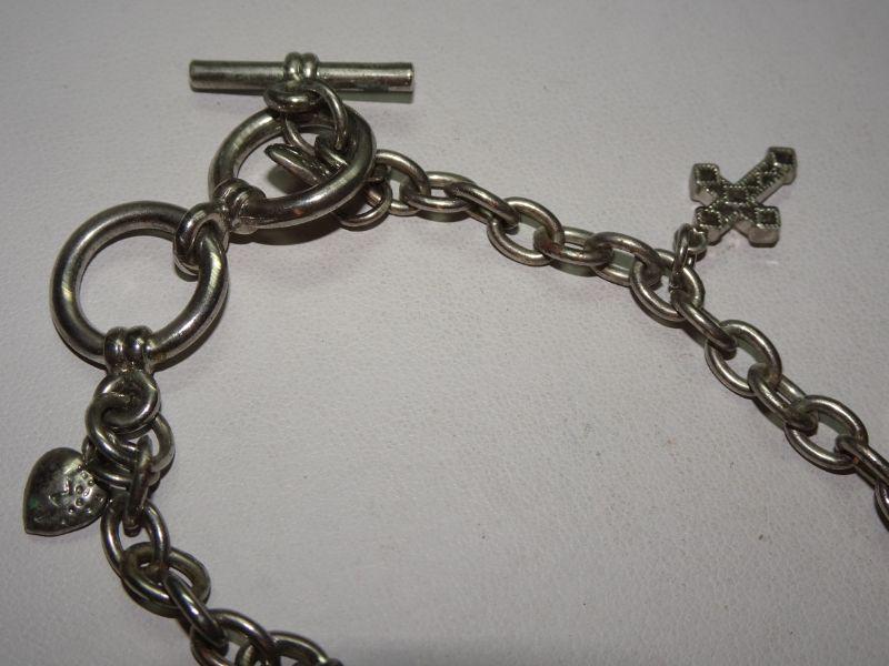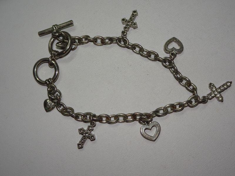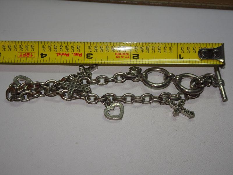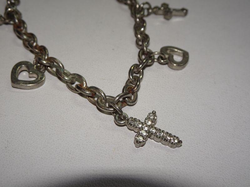 Silver Tone Religious Link Charm Bracelet, Cross & Hearts