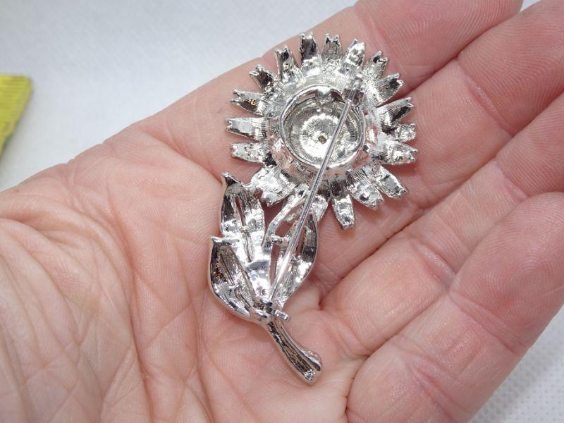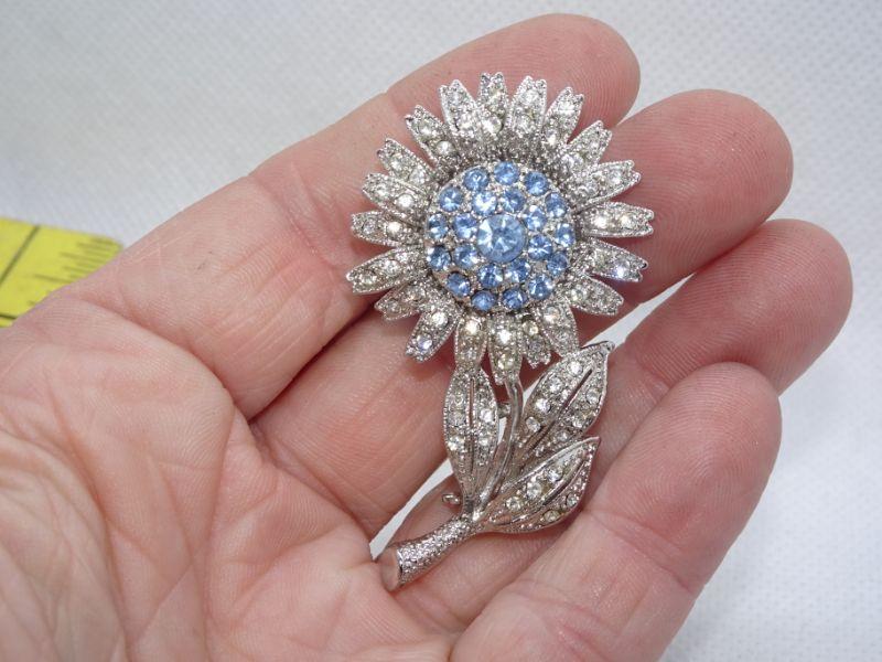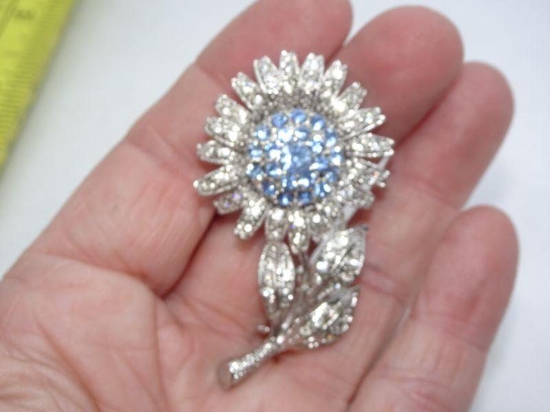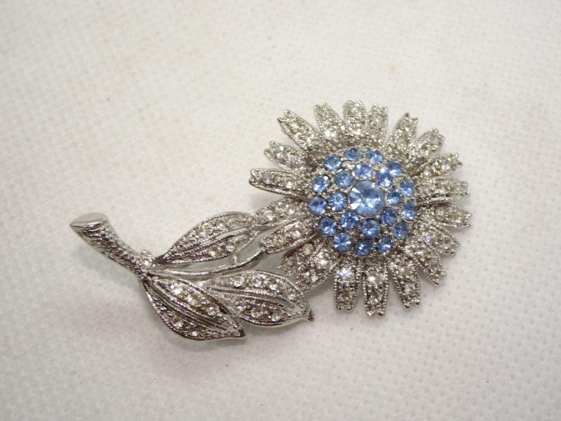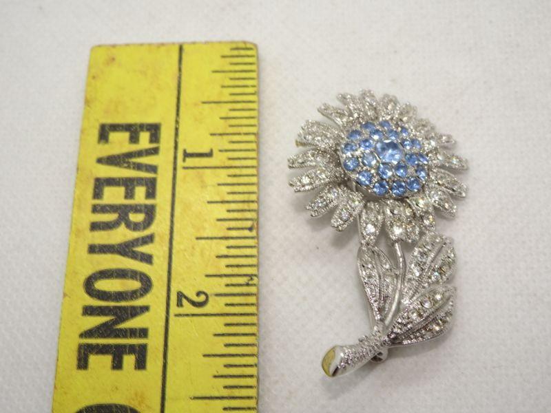 Silver Tone Rhinestone Blue Daisy Flower Pin