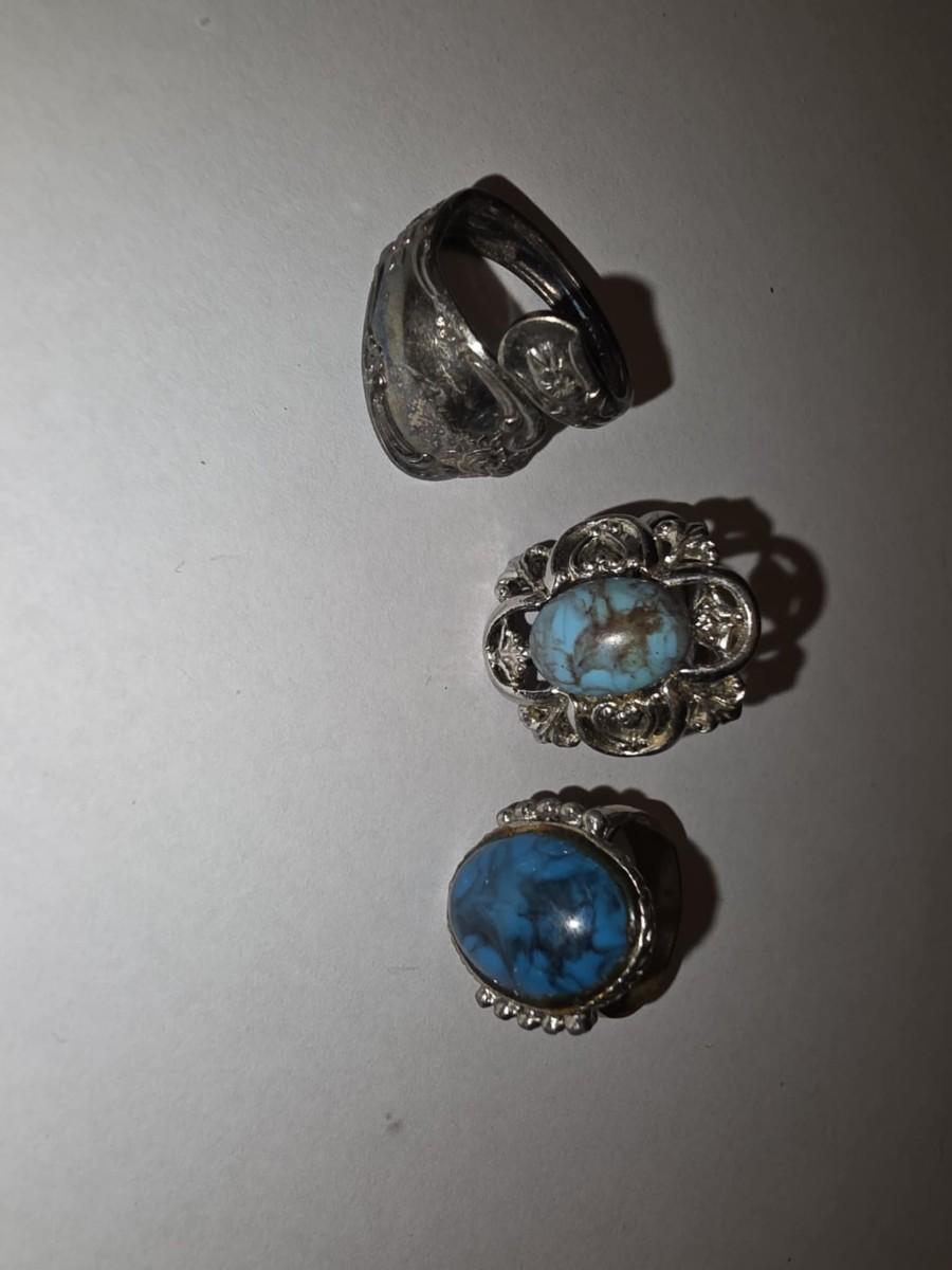 Size 7. Could adjust slightly to 8. All silver metals. Faux turquoise. The one all silver looks a lot like a spoon ring.
