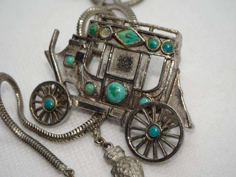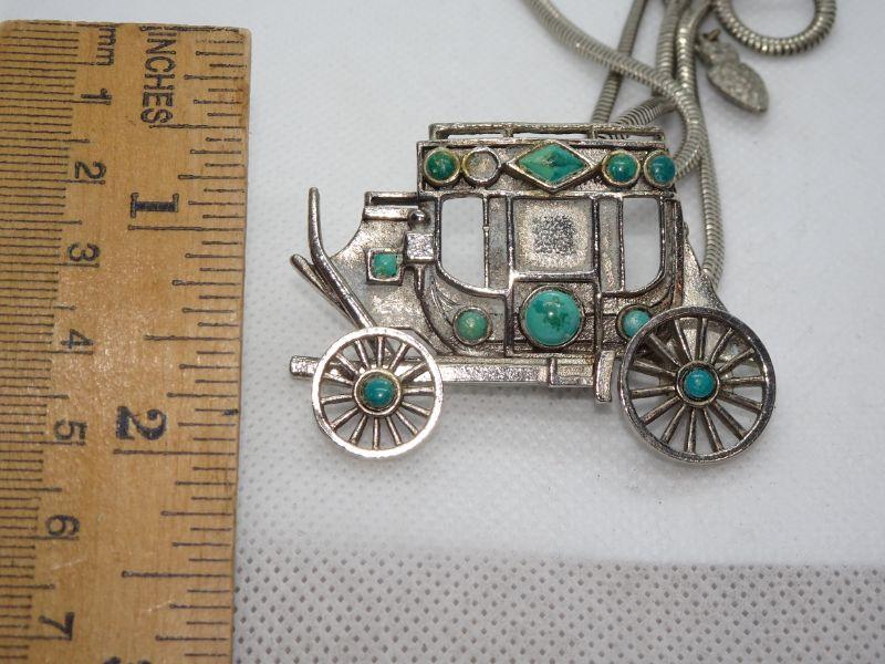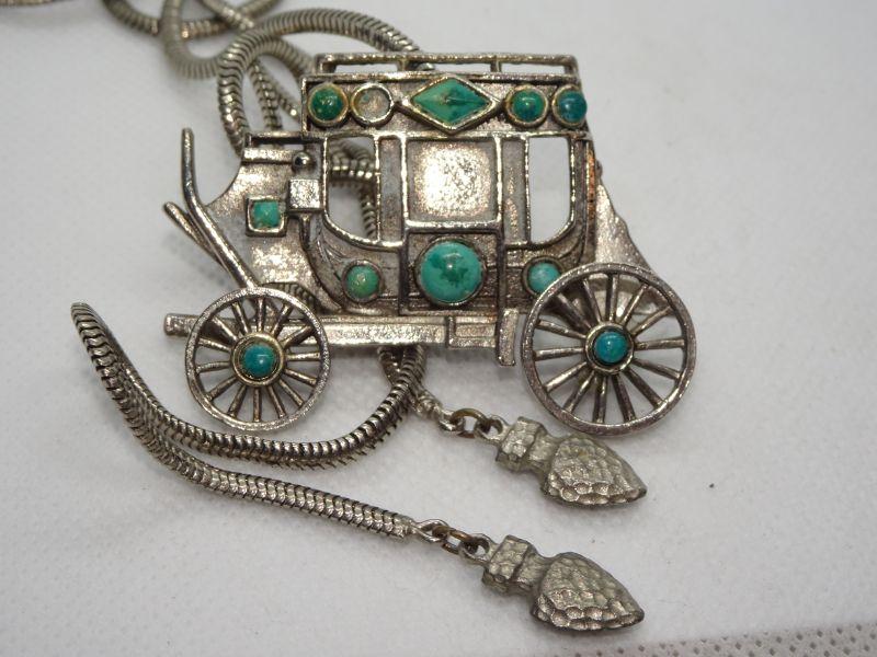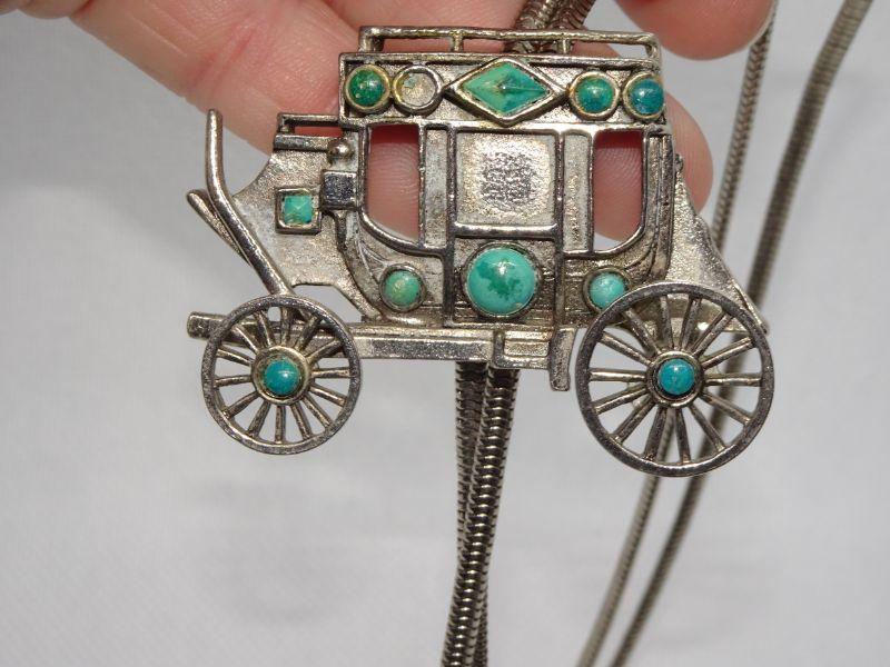 Silver Tone Snake Stagecoach Wagon BOLO Necklace, Turquoise Arrowhead Tassels