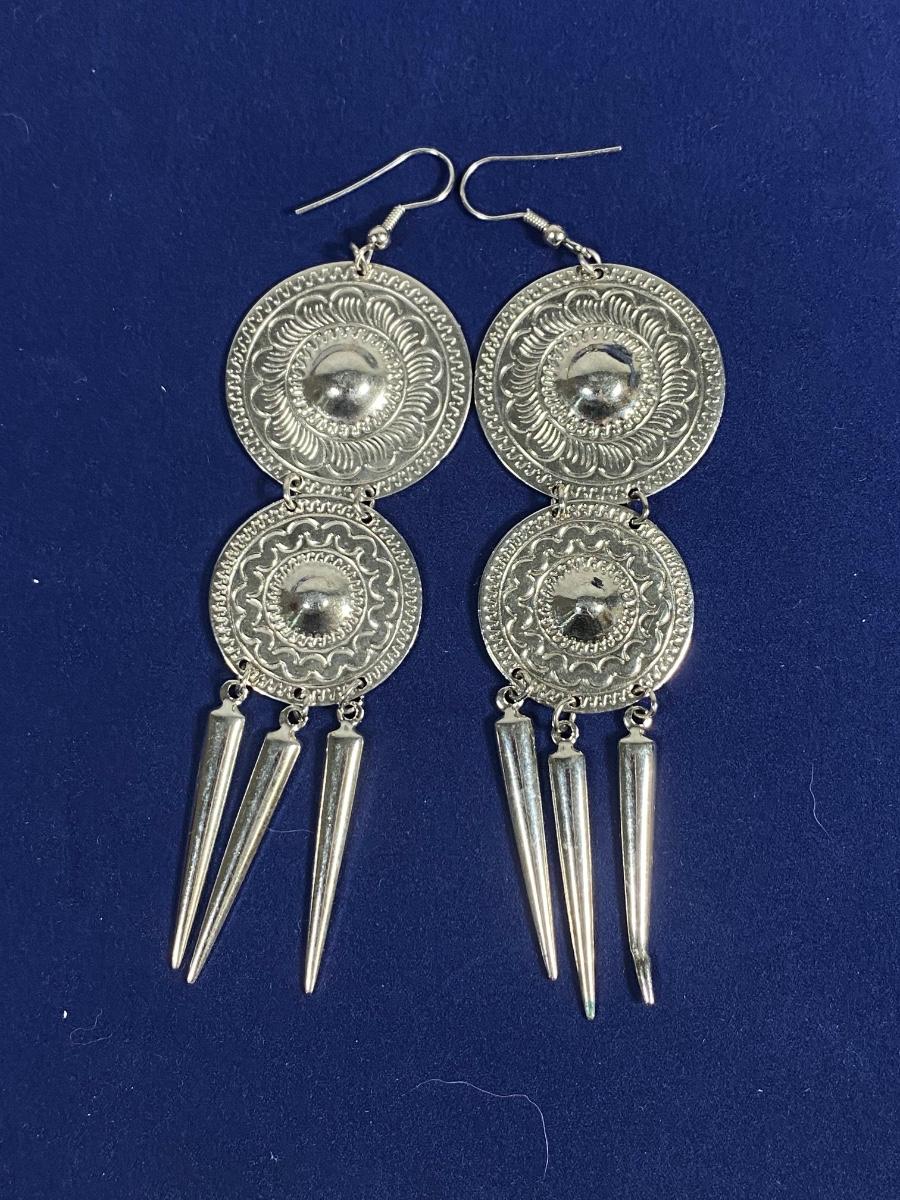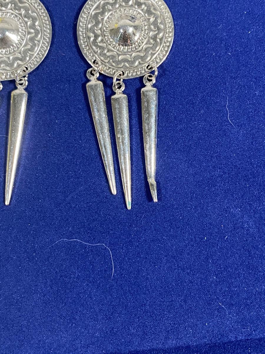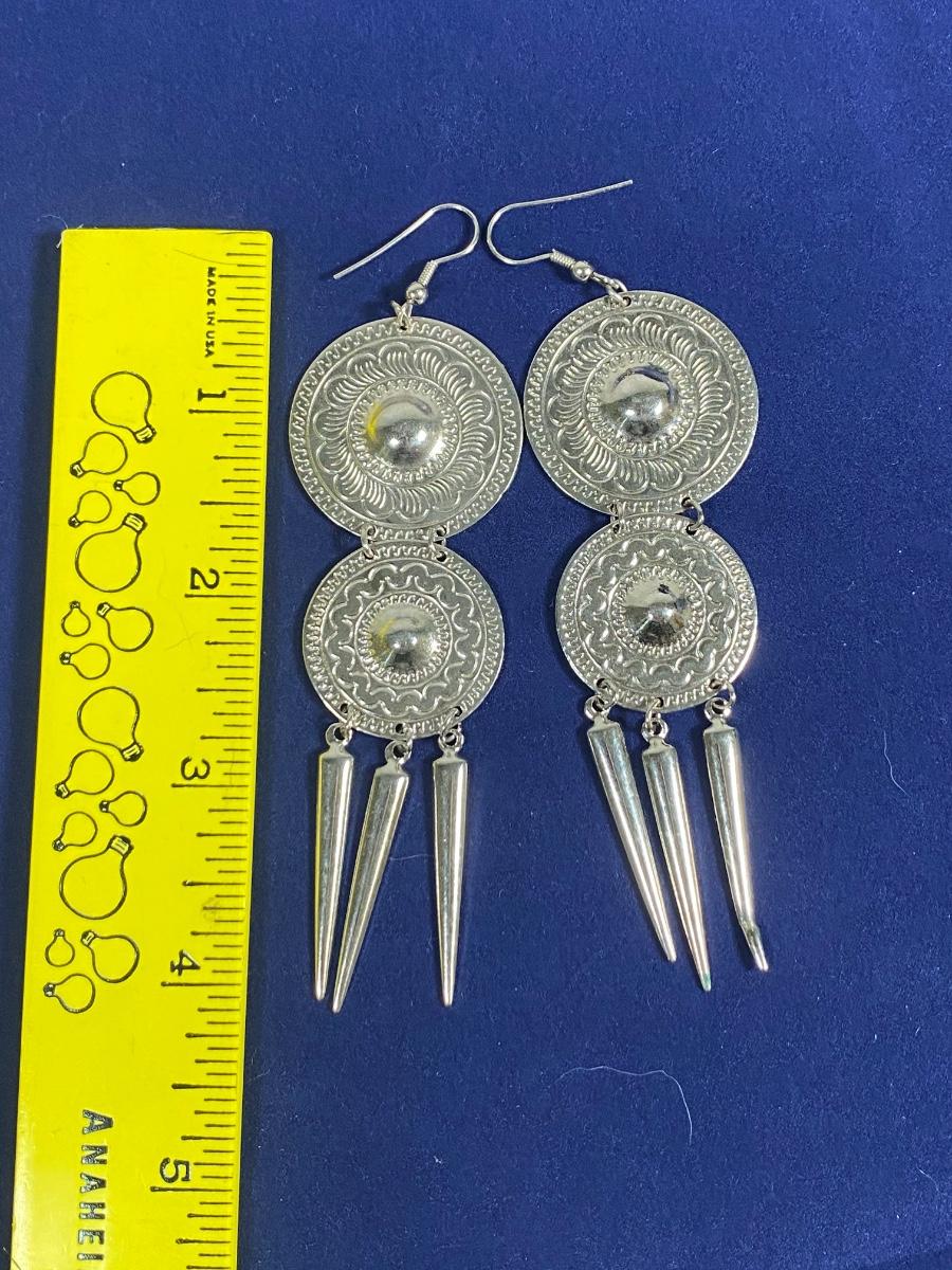 Silver Tone Southwestern Medallion Dangle Earrings. 4" length. one of the points is a little bent. Super lightweight.