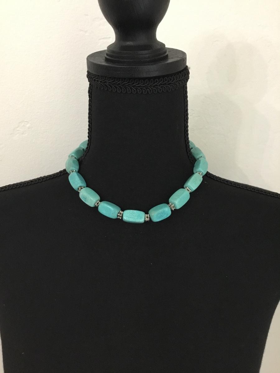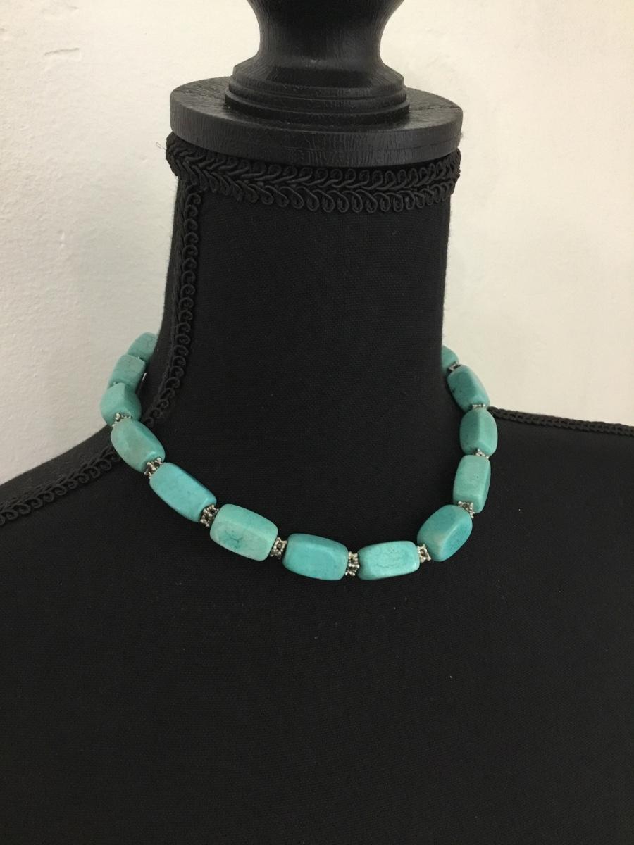 silver tone spacers & lobster claw faux turquoise stones. Southwestern; bohemian; style