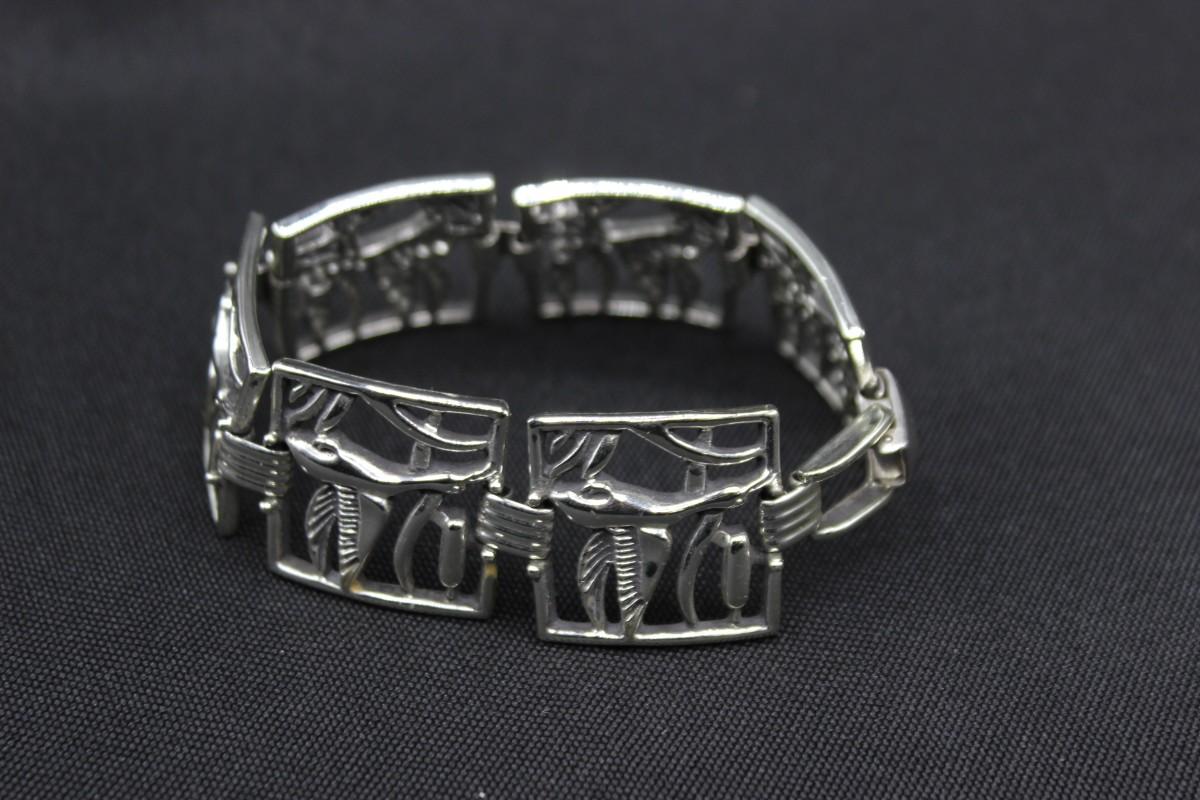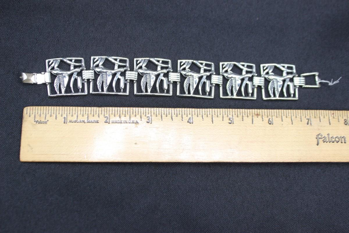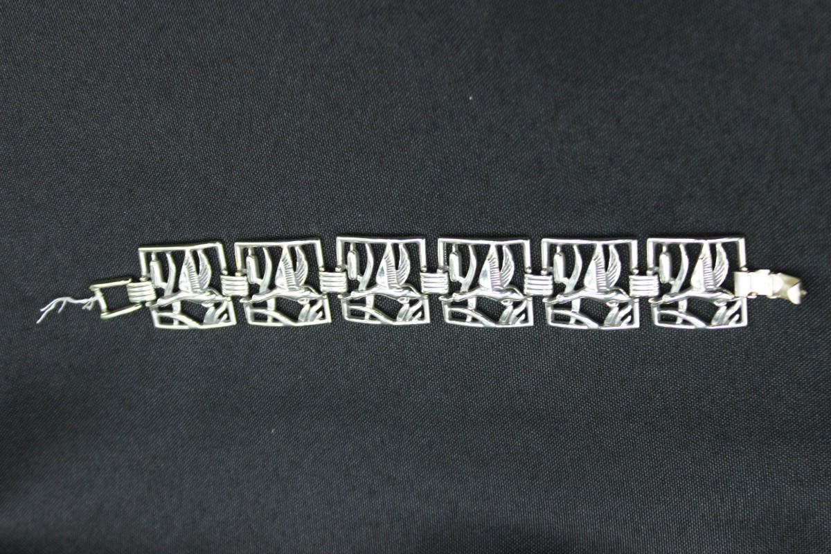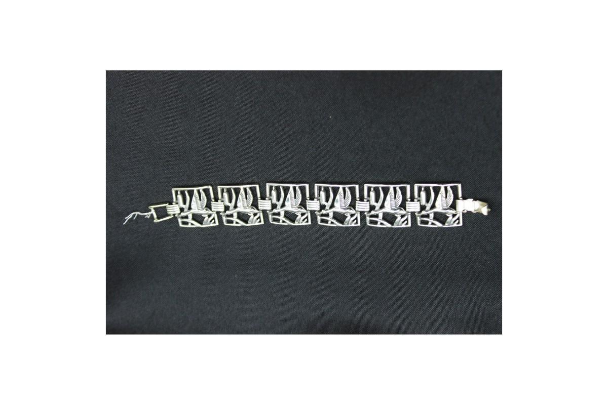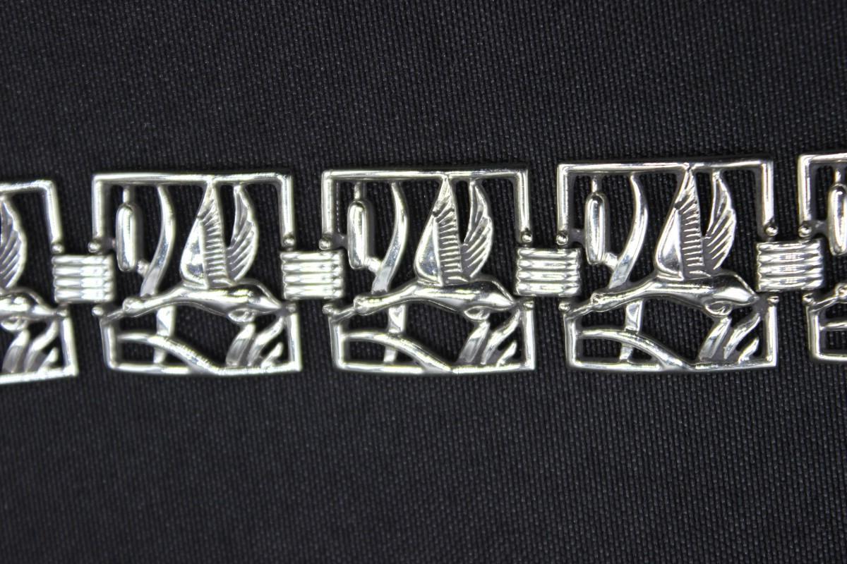 Silver Tone Square Link Bracelet with a Flying Duck Pattern. Unmarked, good condition.