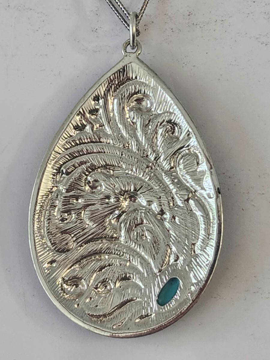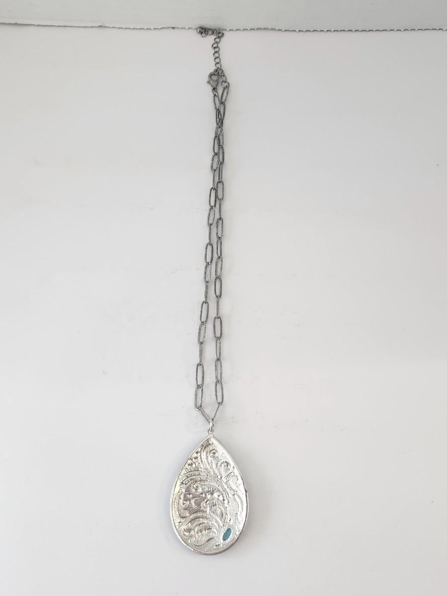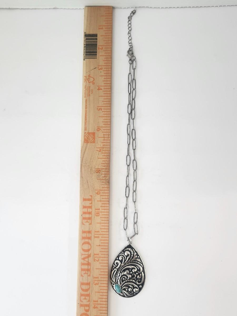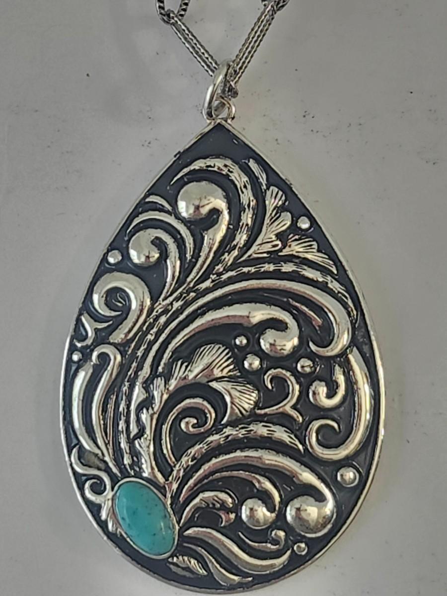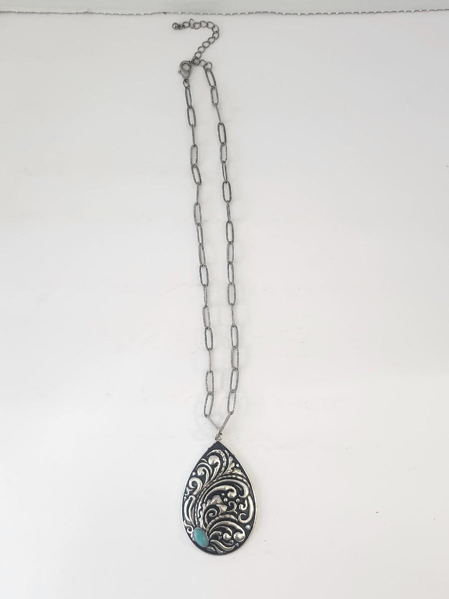 Silver Tone Teardrop Necklace With Ornate Scrollwork and Turquoise Color Accent