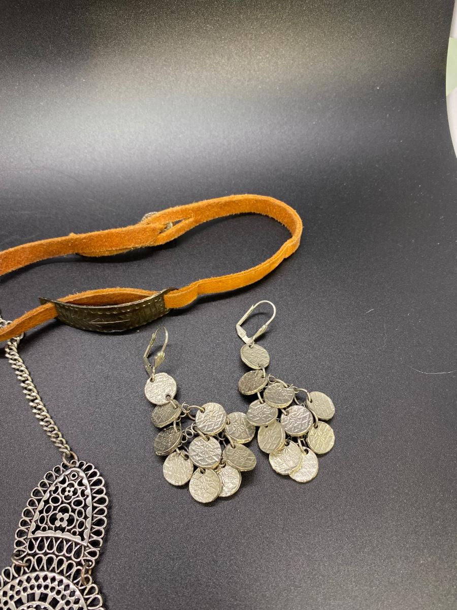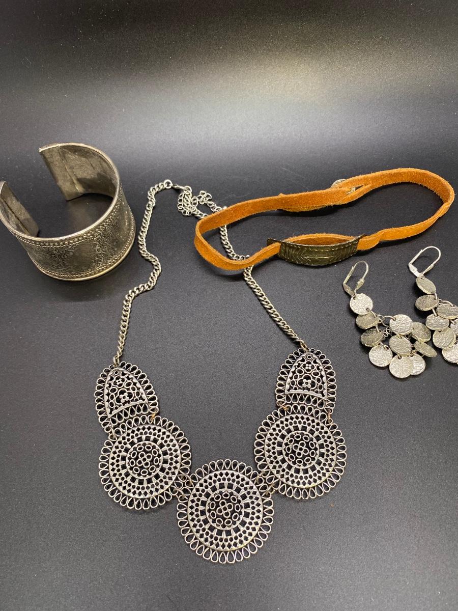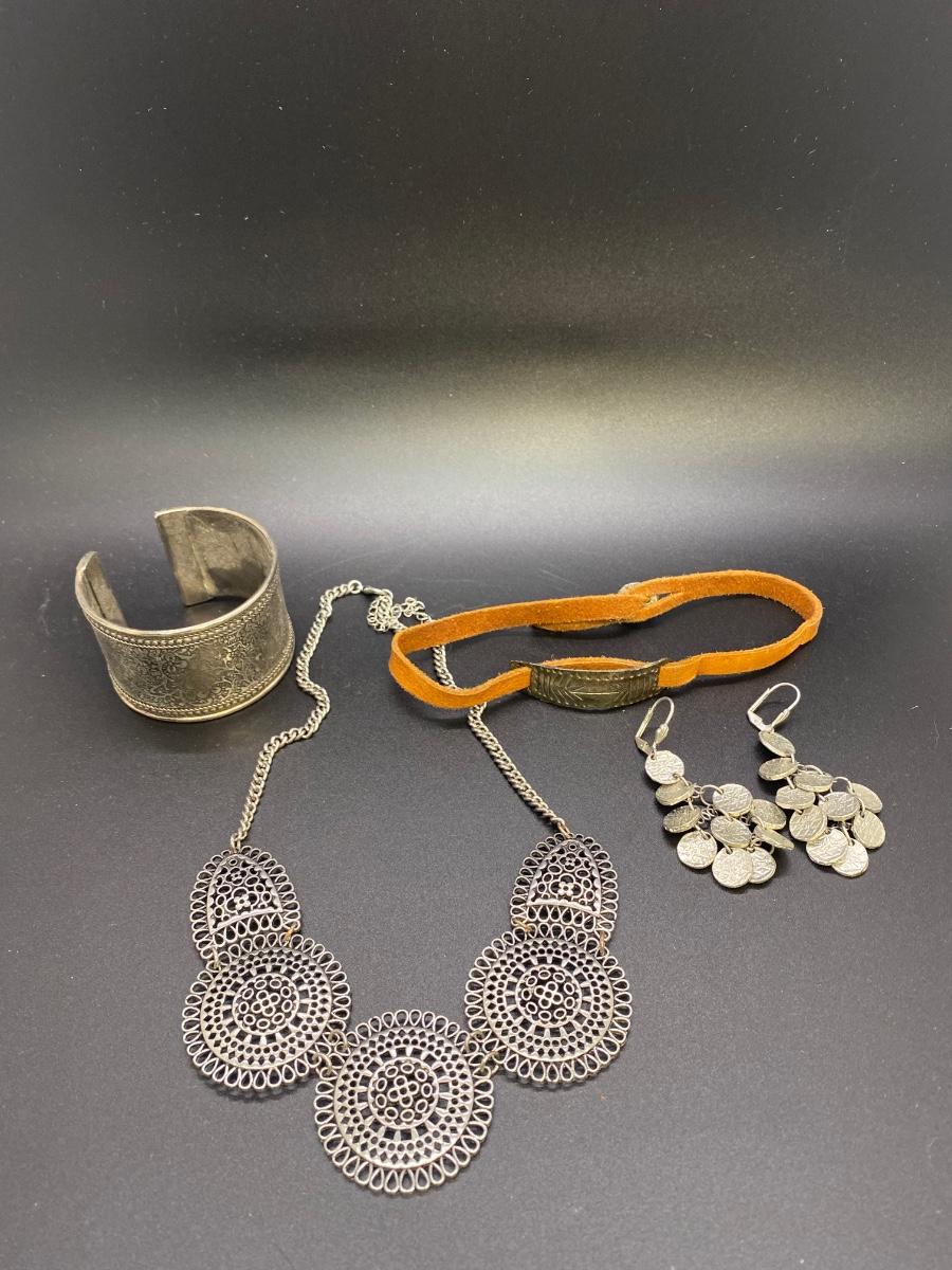 Silver tone fashion jewelry lot. Pair of necklaces, a cuff bracelet, and dangling earrings. All in good condition.