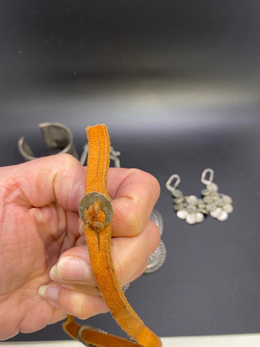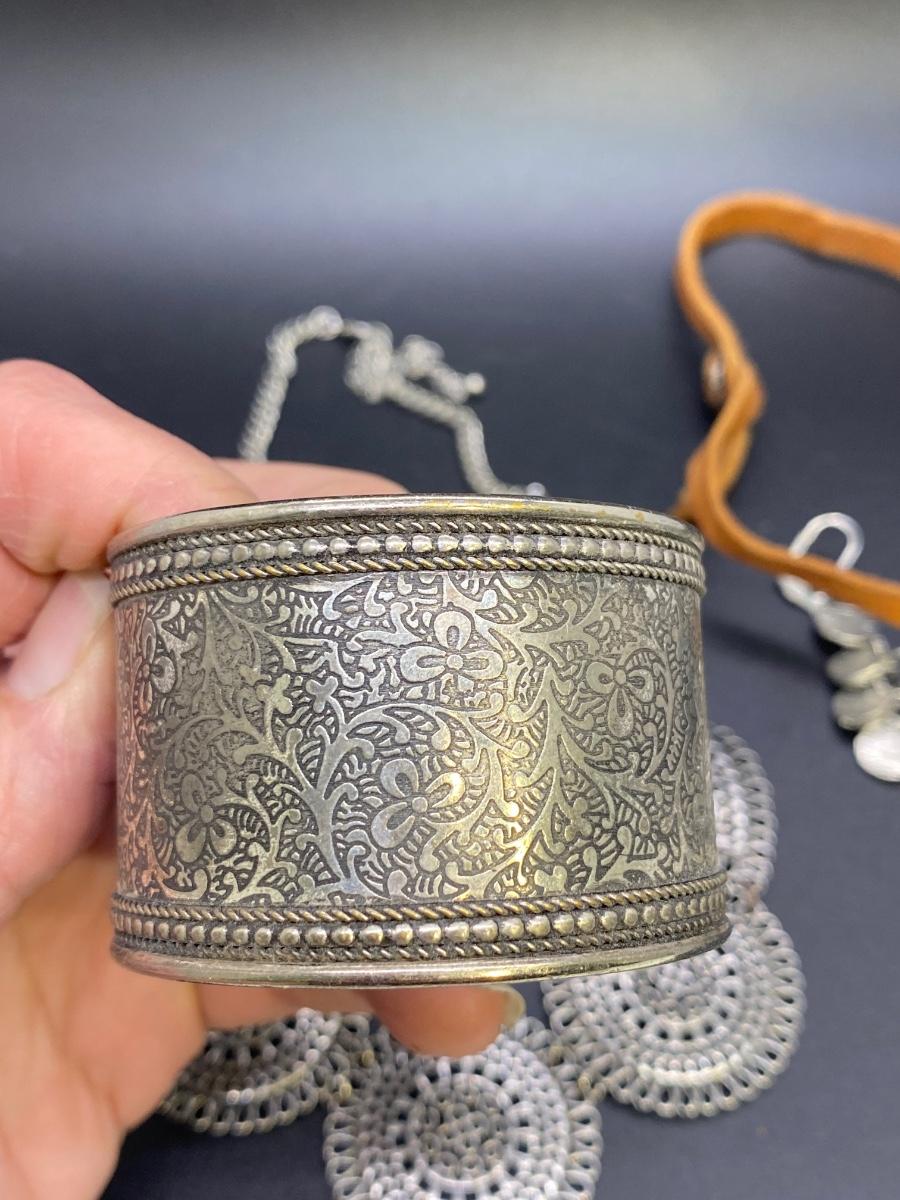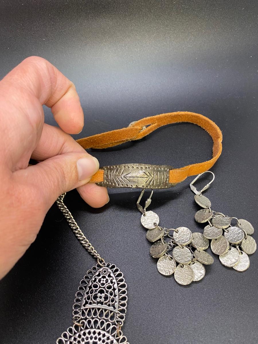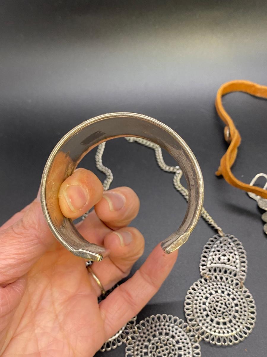 Silver tone fashion jewelry lot. Pair of necklaces, a cuff bracelet, and dangling earrings. All in good condition.