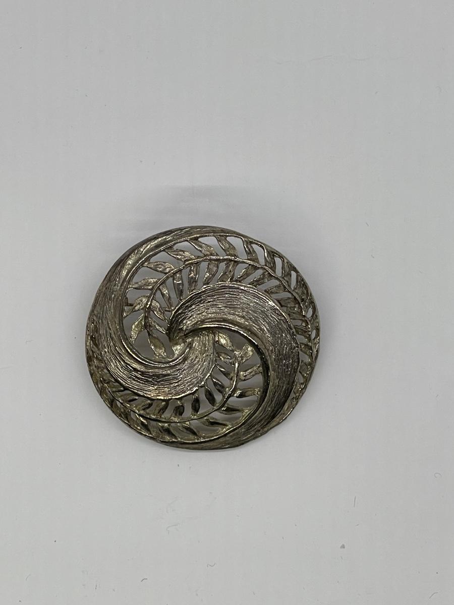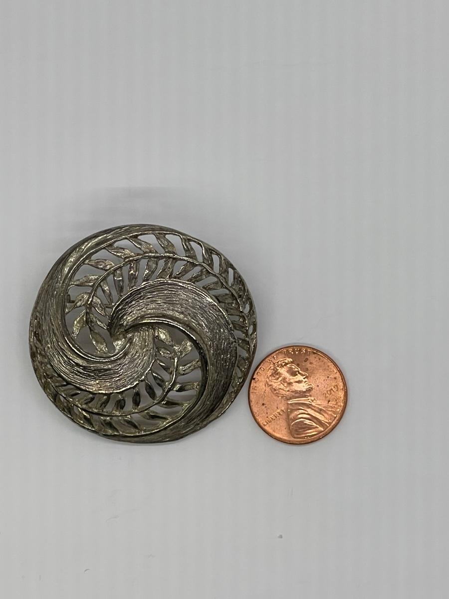Silver Tone Vine Swirl Medallion Pin Brooch. Unsigned, about 2" size.
