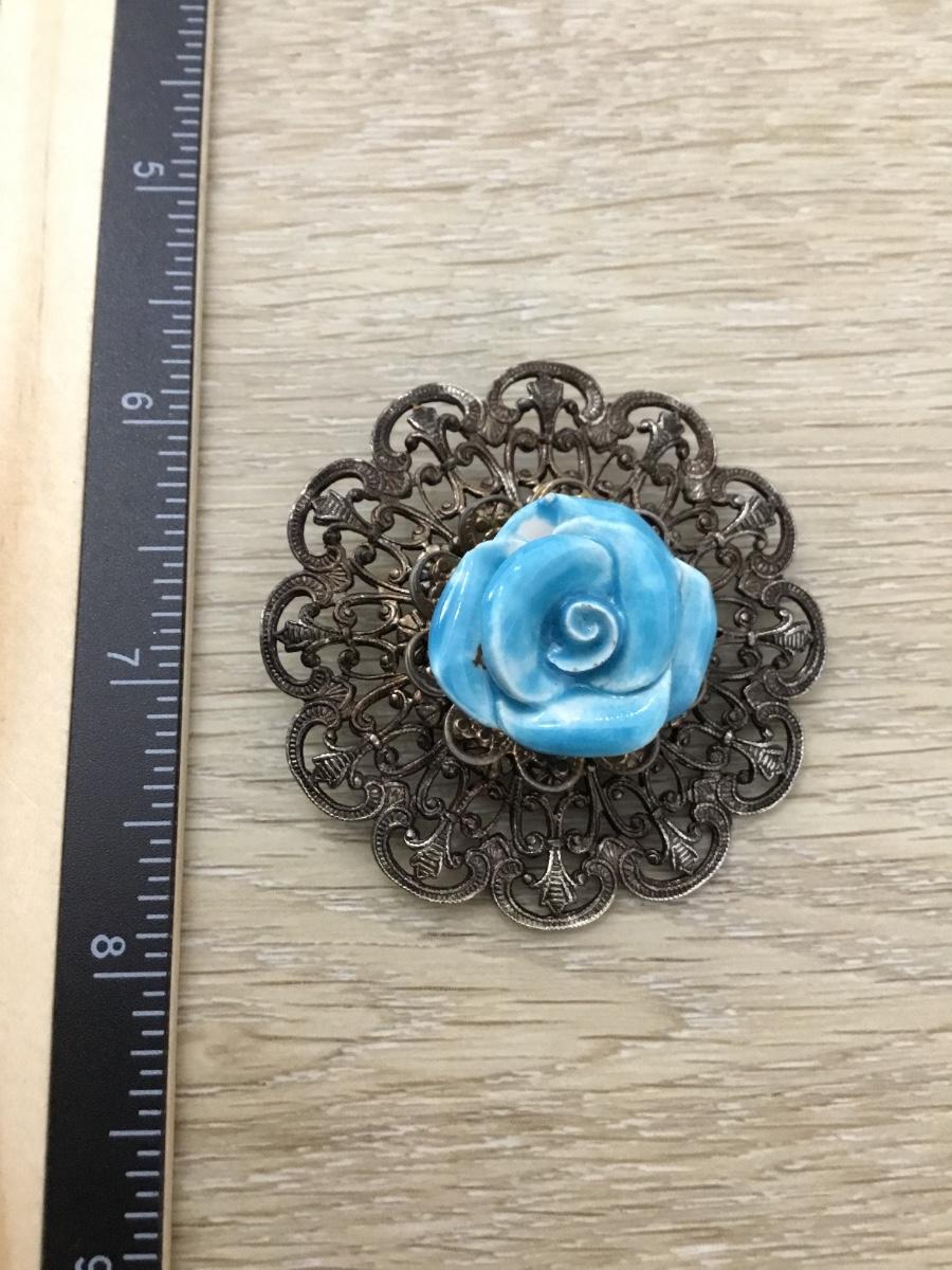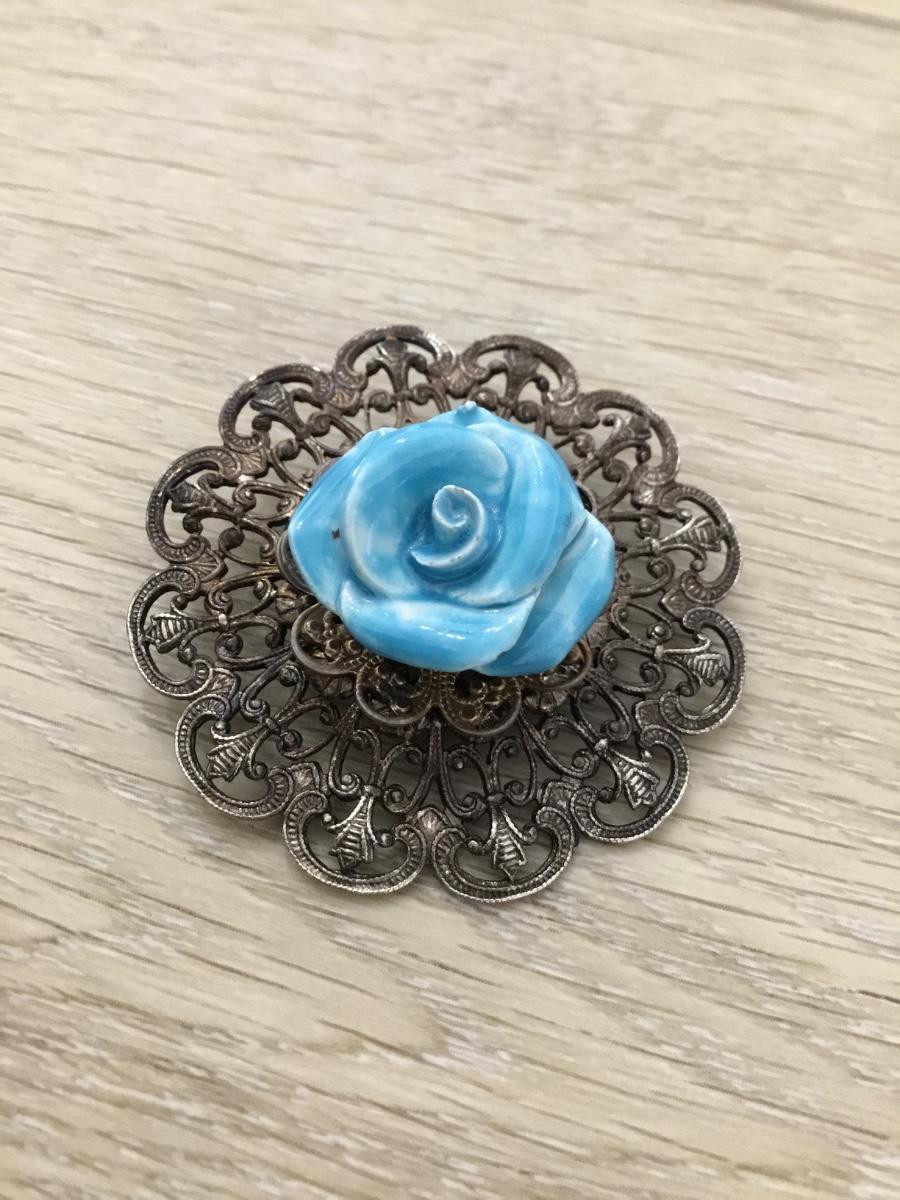 Silver tone vintage blue glass type rose center pin