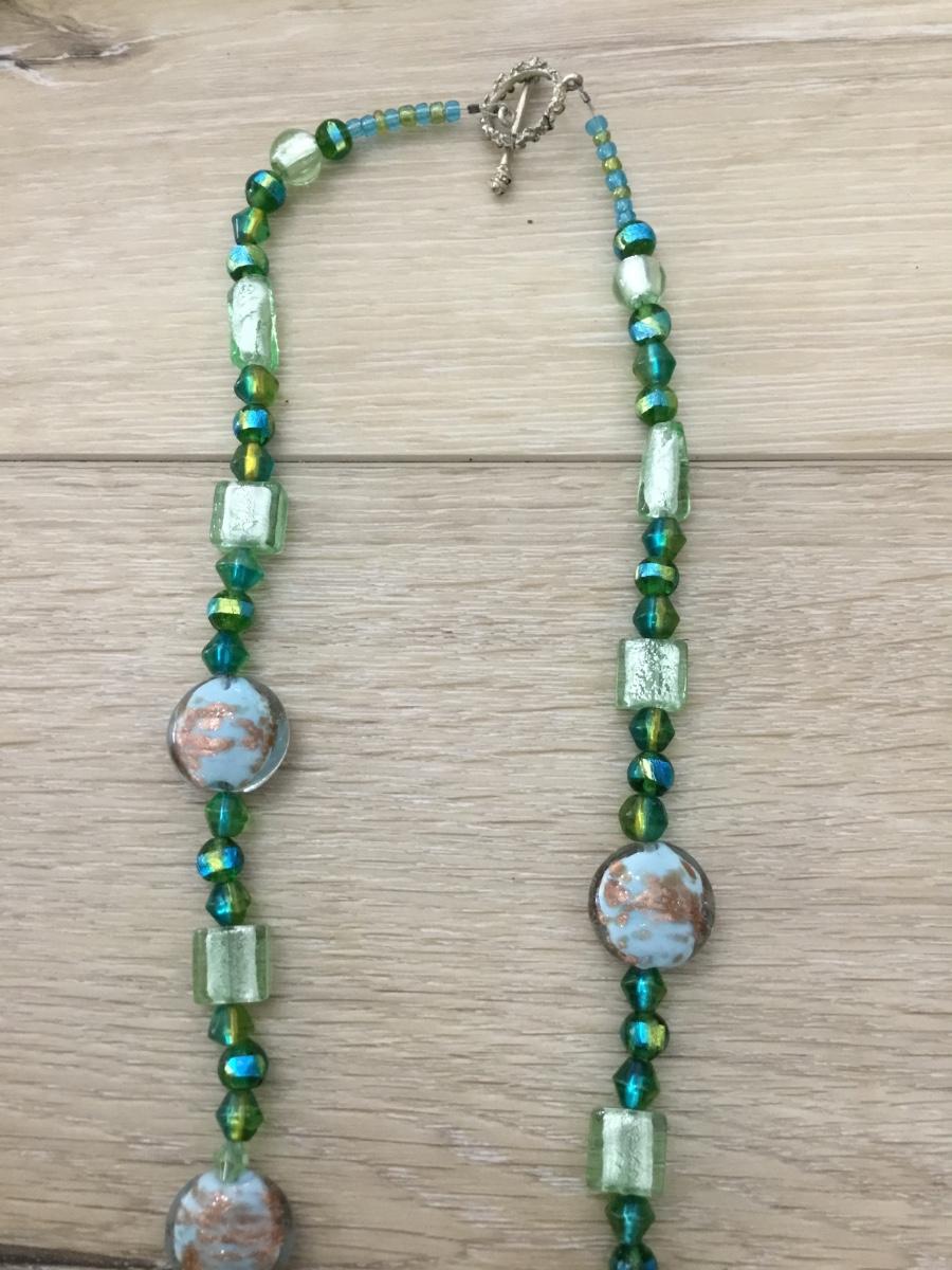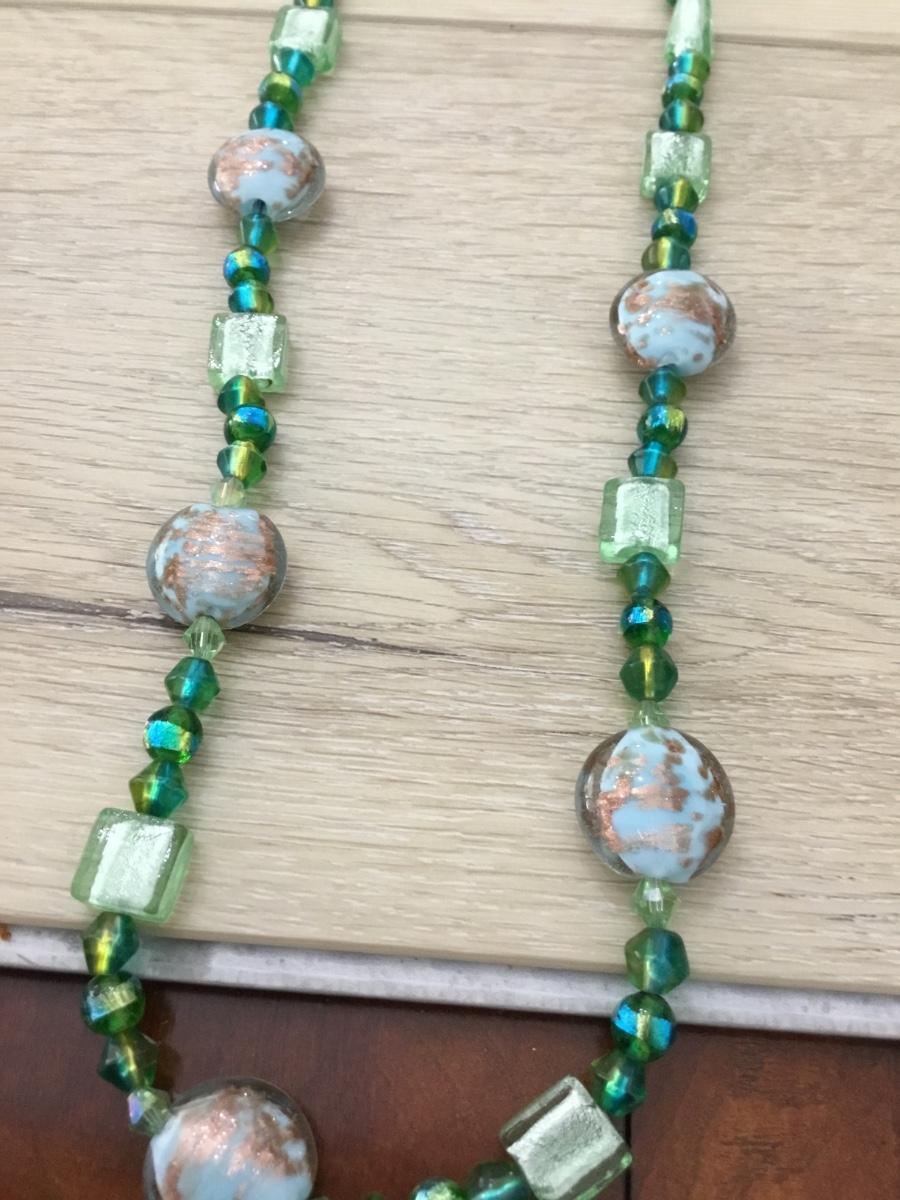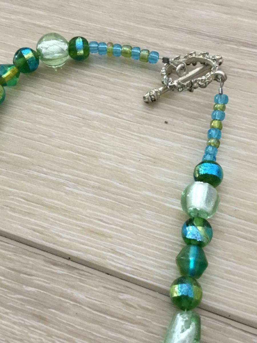 Silver tone vintage green and blue glass beaded necklace