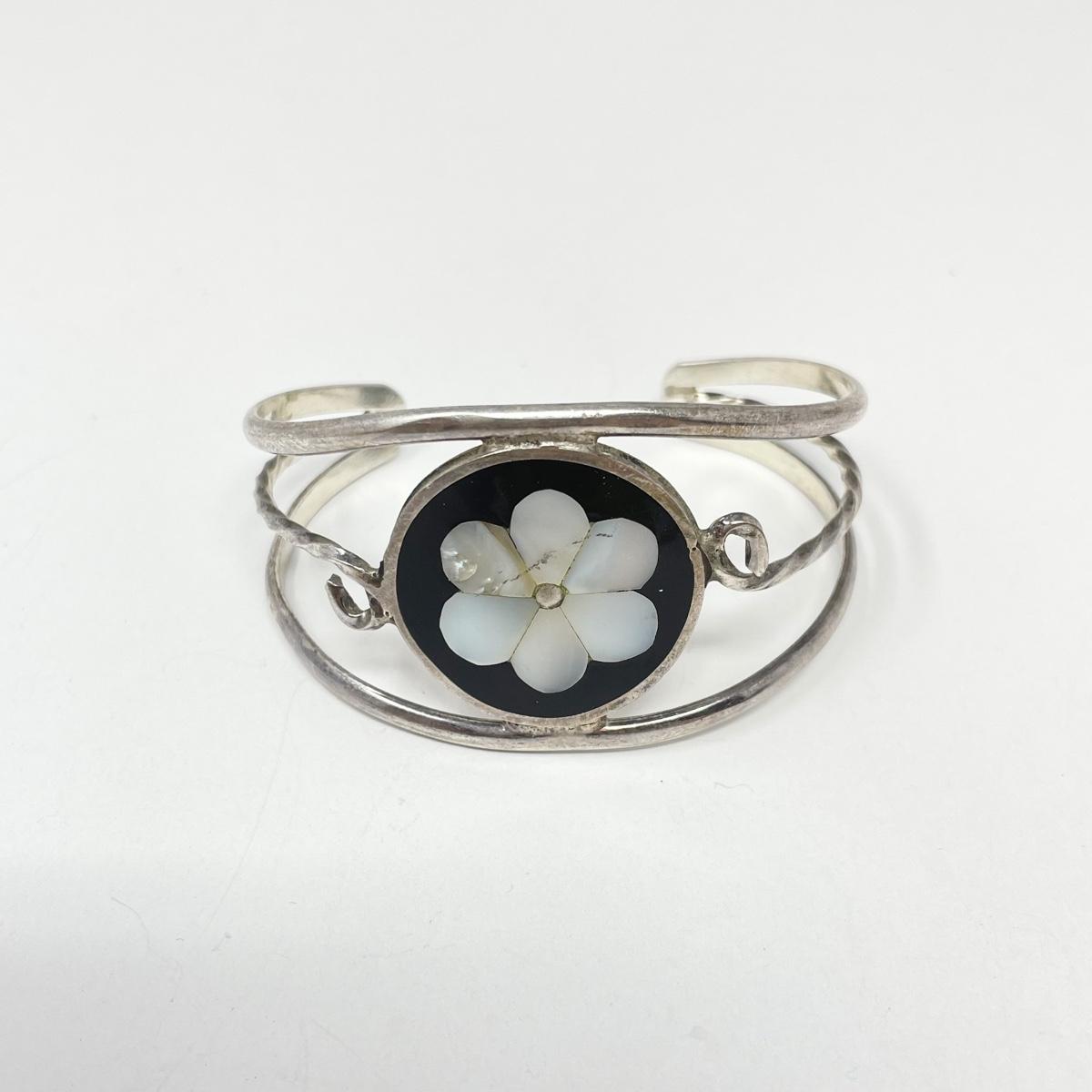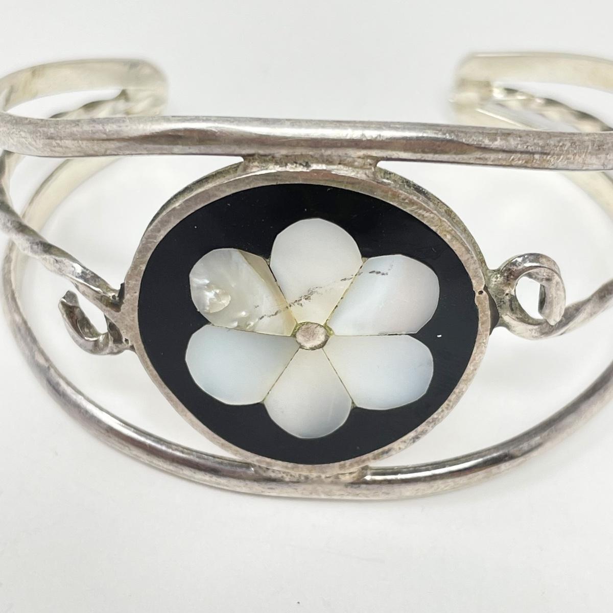 SILVER TONED AND INLAID MOTHER OF PEARL FLOWER CUFF BRACELET
