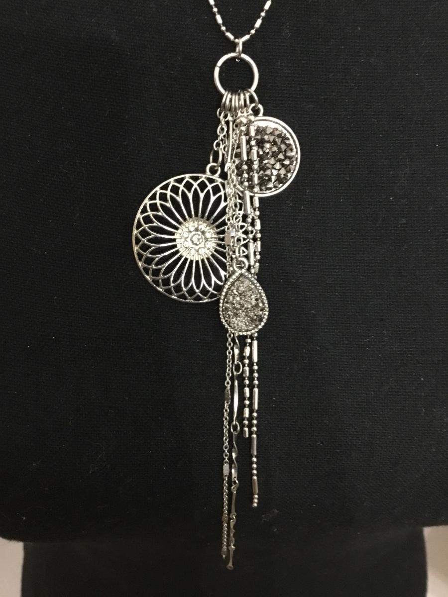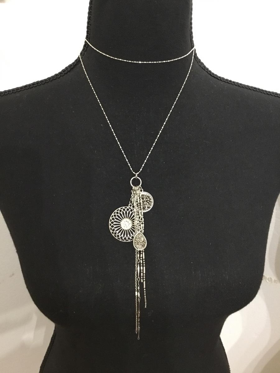 Silver toned BoHo style multi layered necklace with dangling charms and tassels