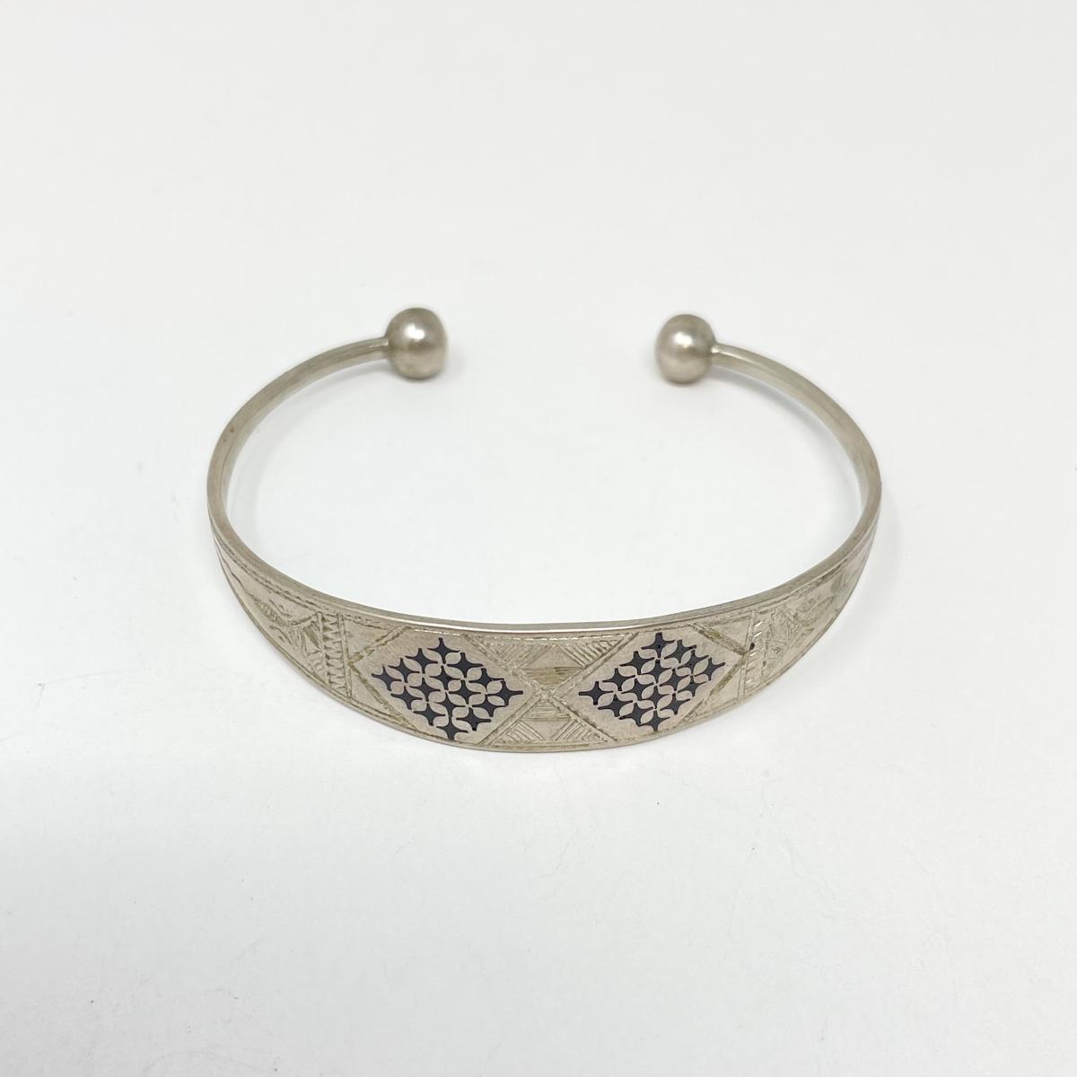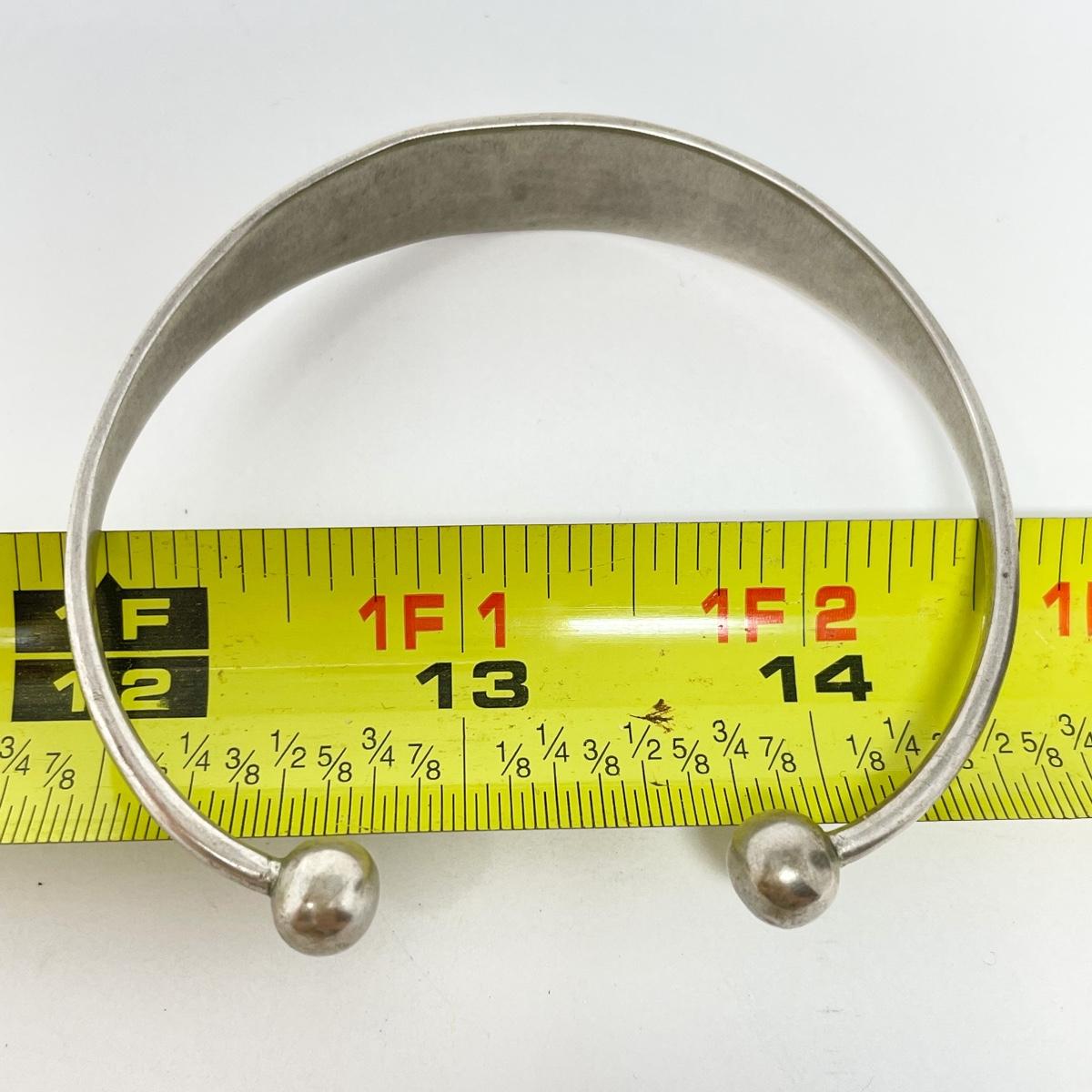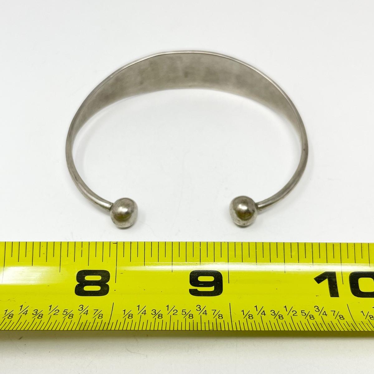In good condition. Unsure of material but did not find a marking for sterling silver - however it is a fairly heavy bracelet. Inside diameter measures approx 2.5”.