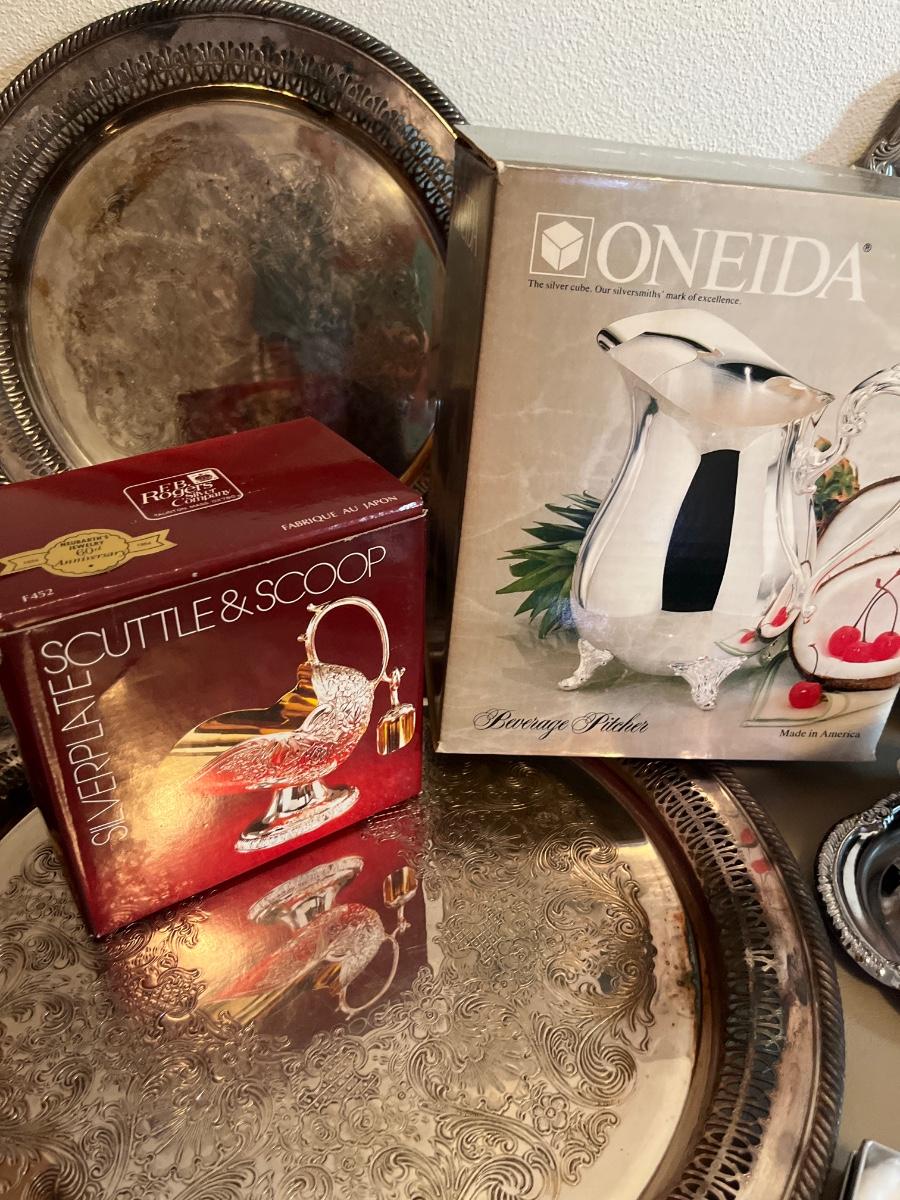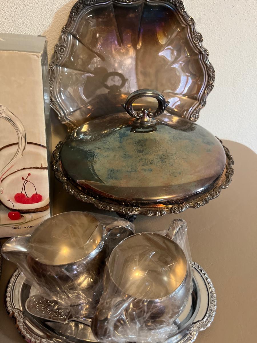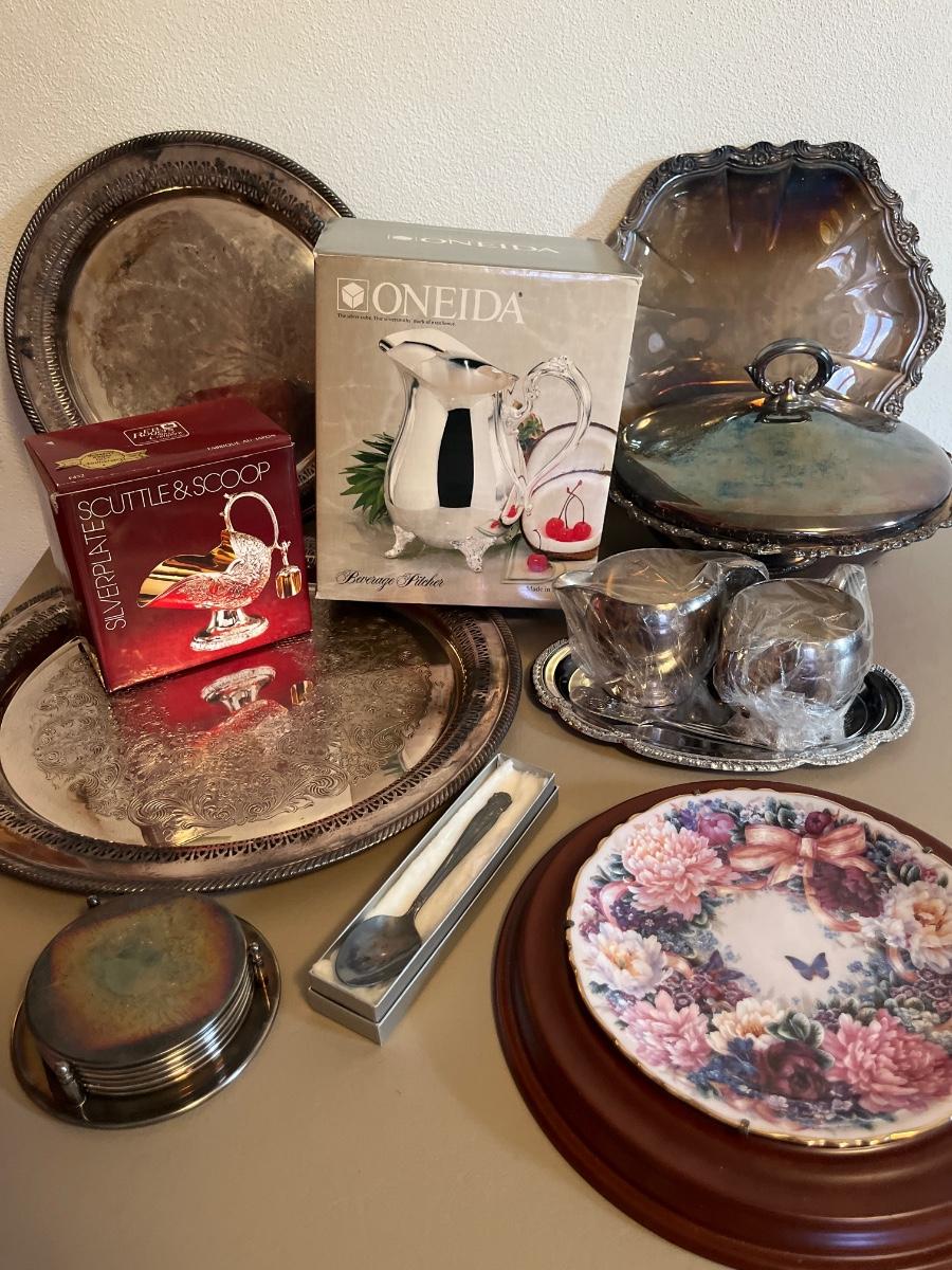 Silver trays, pitchers, casserole, class of 1951 spoon