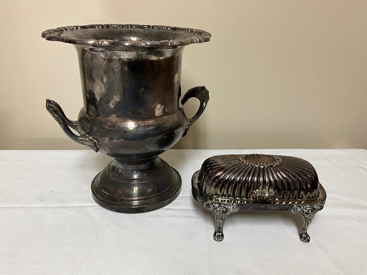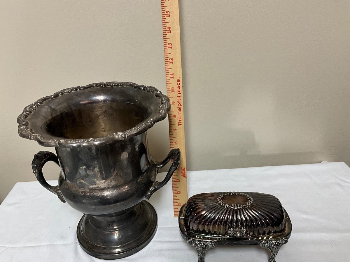 Gorham Heritage Silver Plate trophy cup champagne, chiller ice bucket, and FR Rogers Butterdish