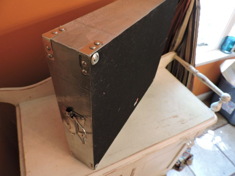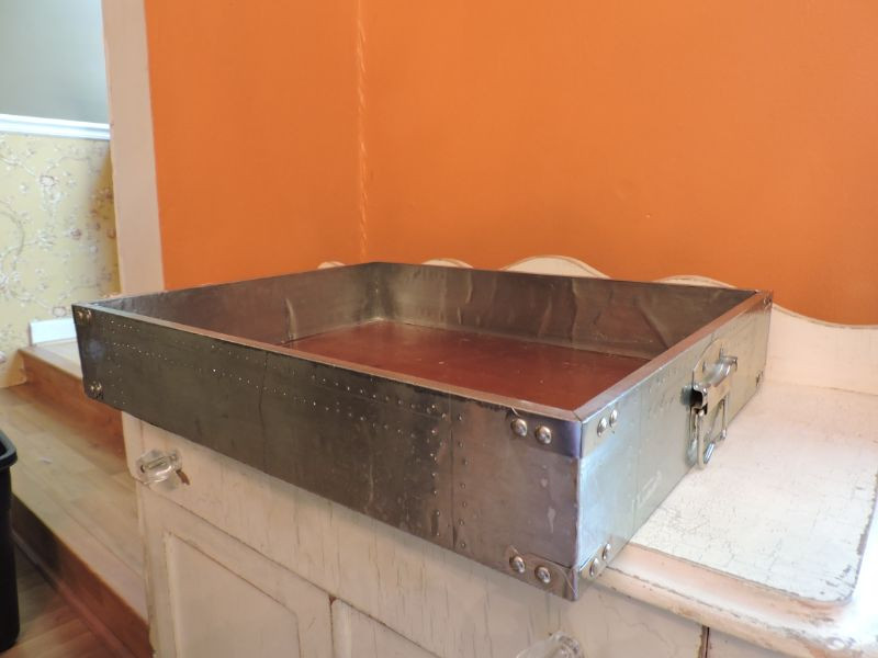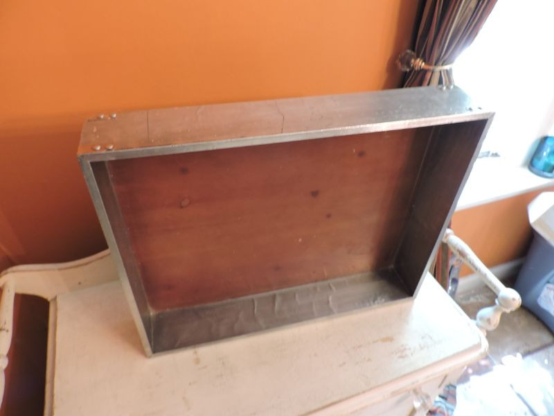 Silver covered wooden serving or decorative tray with metal handles and rivets. 20”x16”x4”.