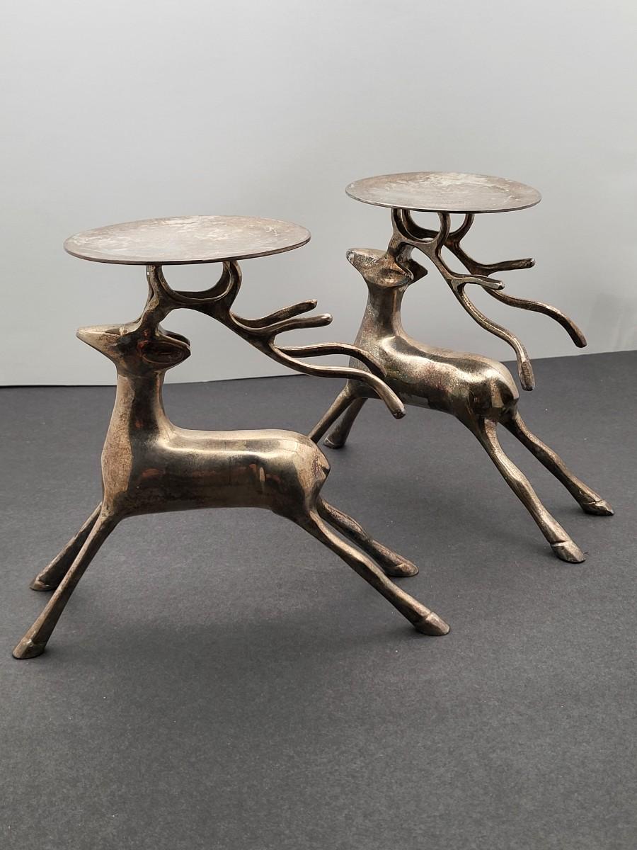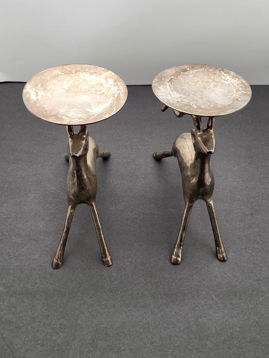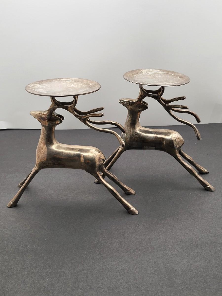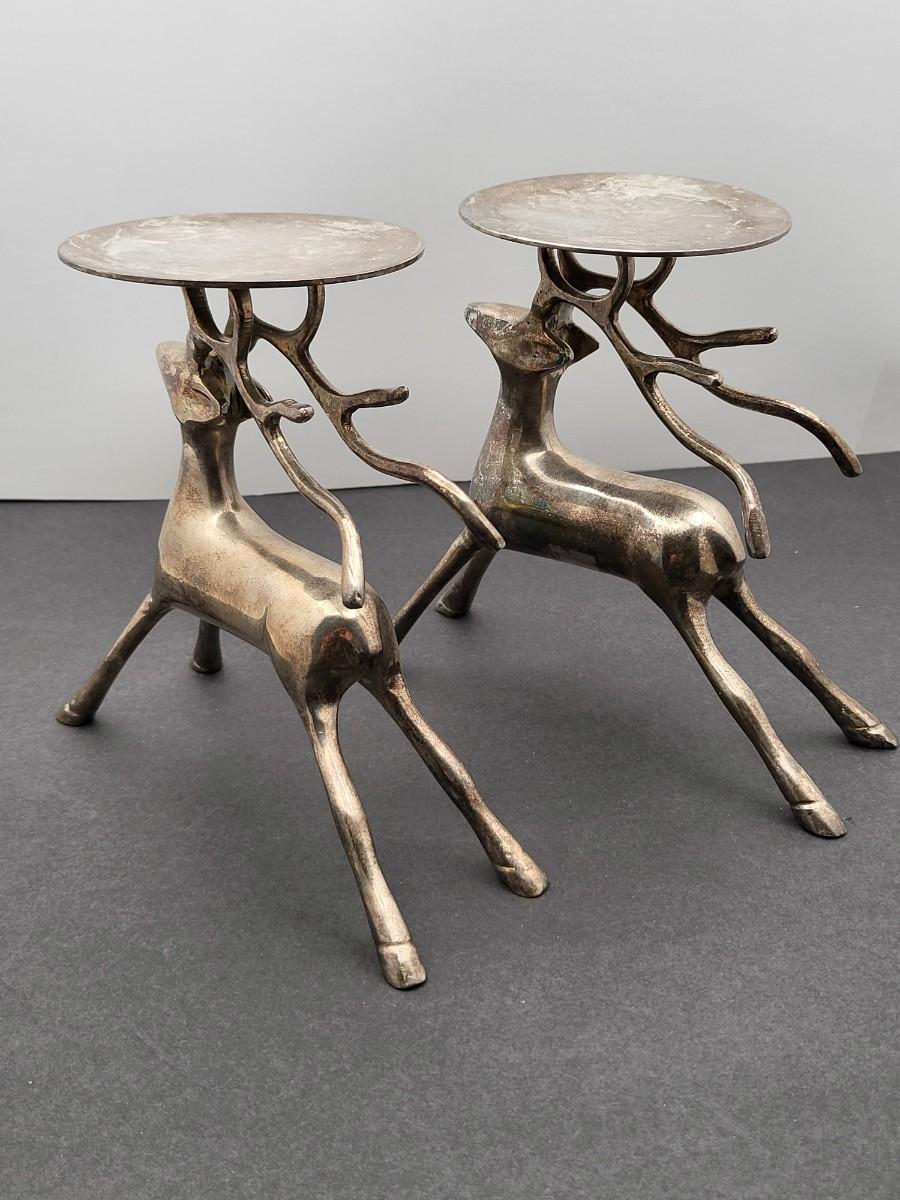 Silverplate brass deer, 7" x 6.5", pillar candle holders. Nice patina but could be polished up. Holiday decor or year round country themed decor.