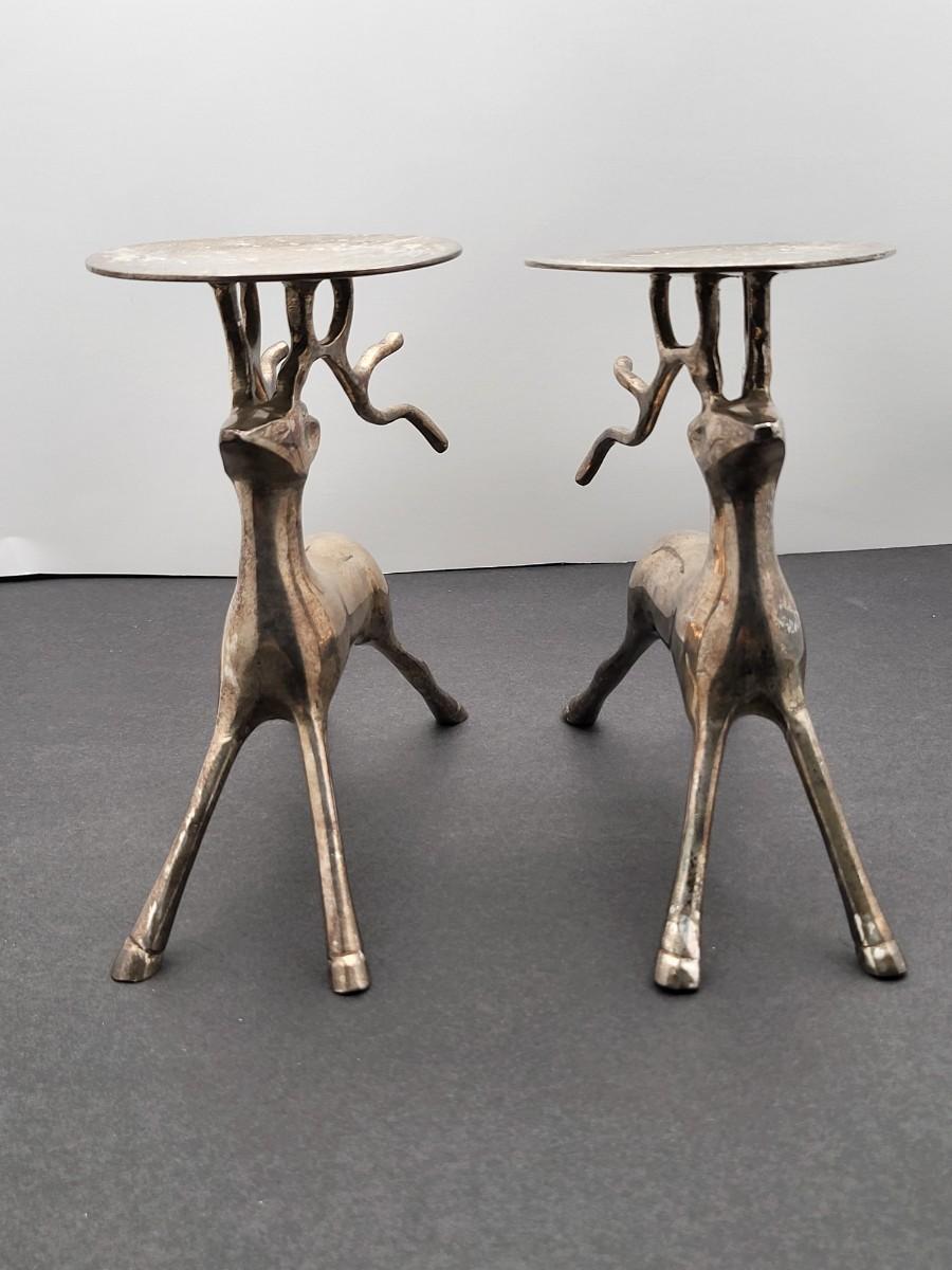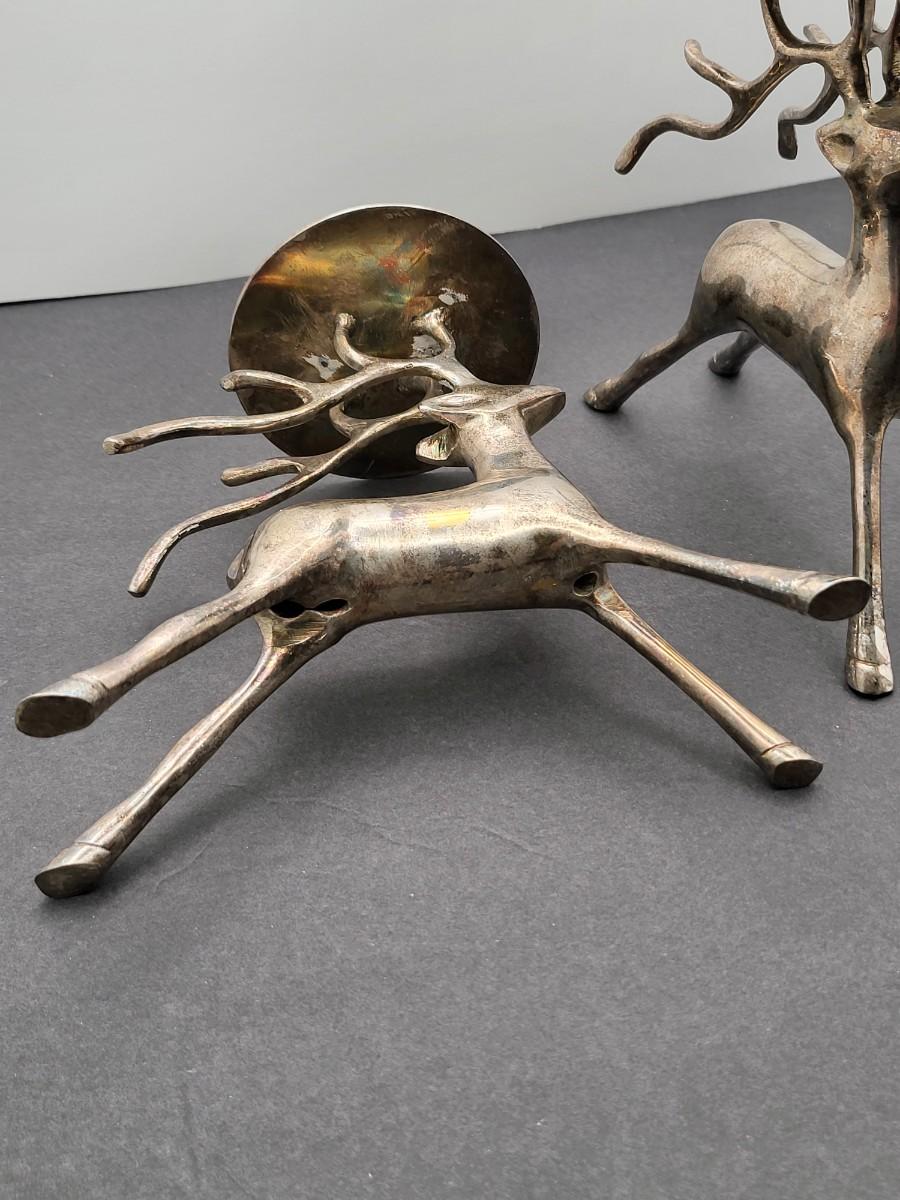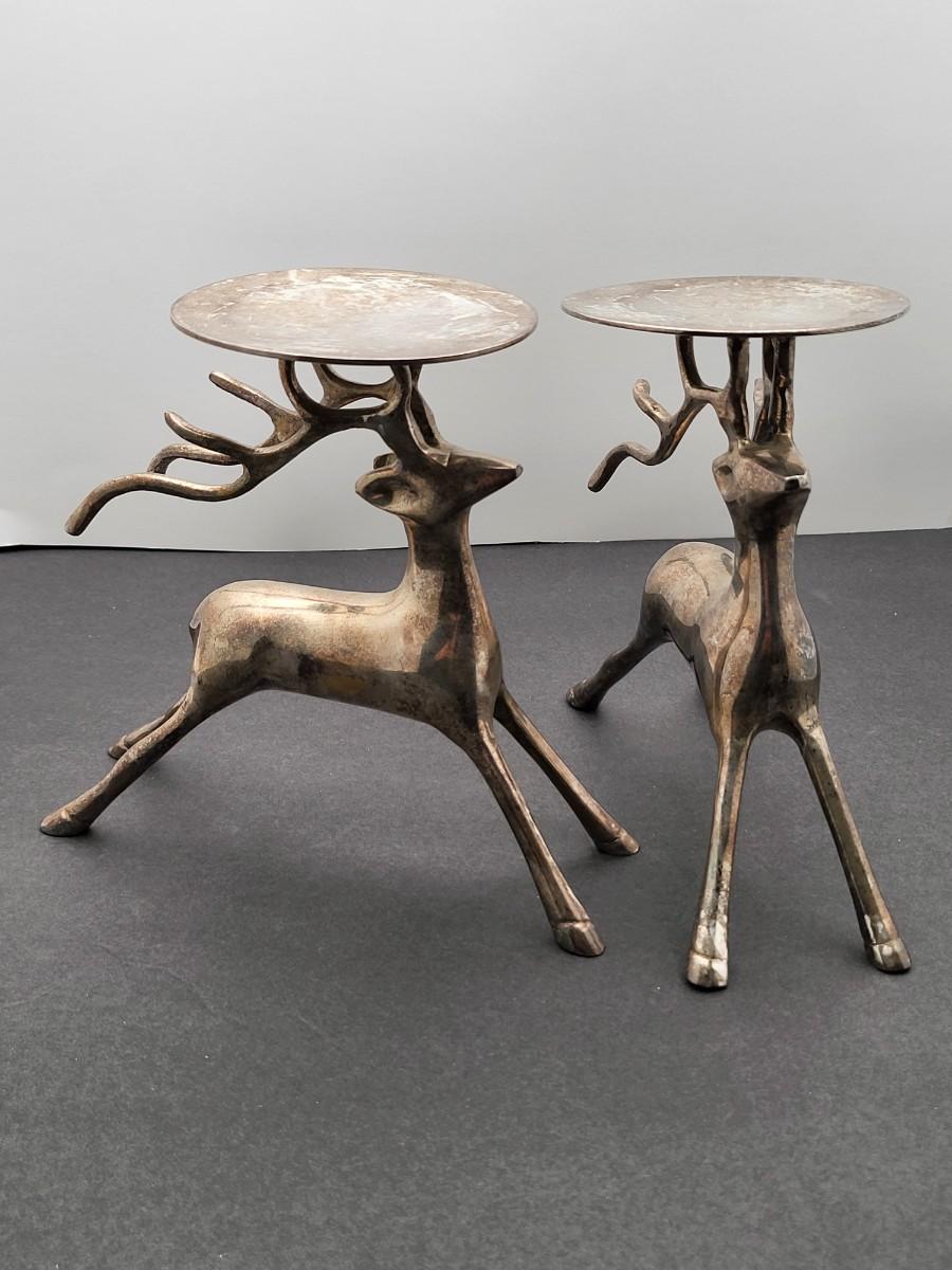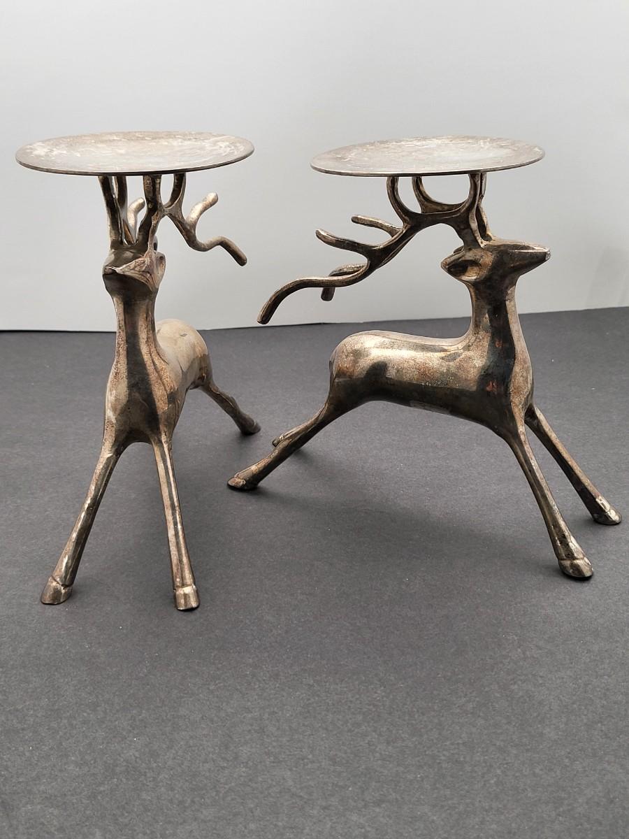 Silverplate brass deer, 7" x 6.5", pillar candle holders. Nice patina but could be polished up. Holiday decor or year round country themed decor.