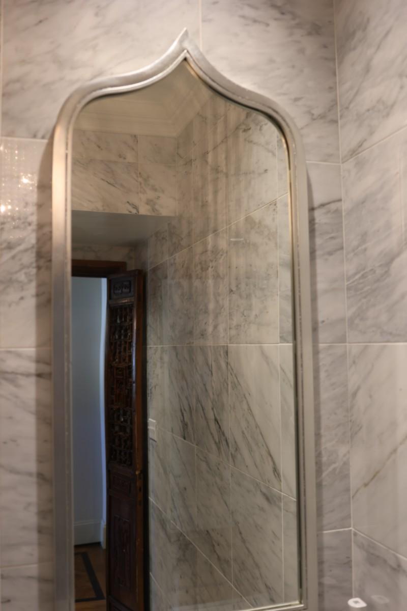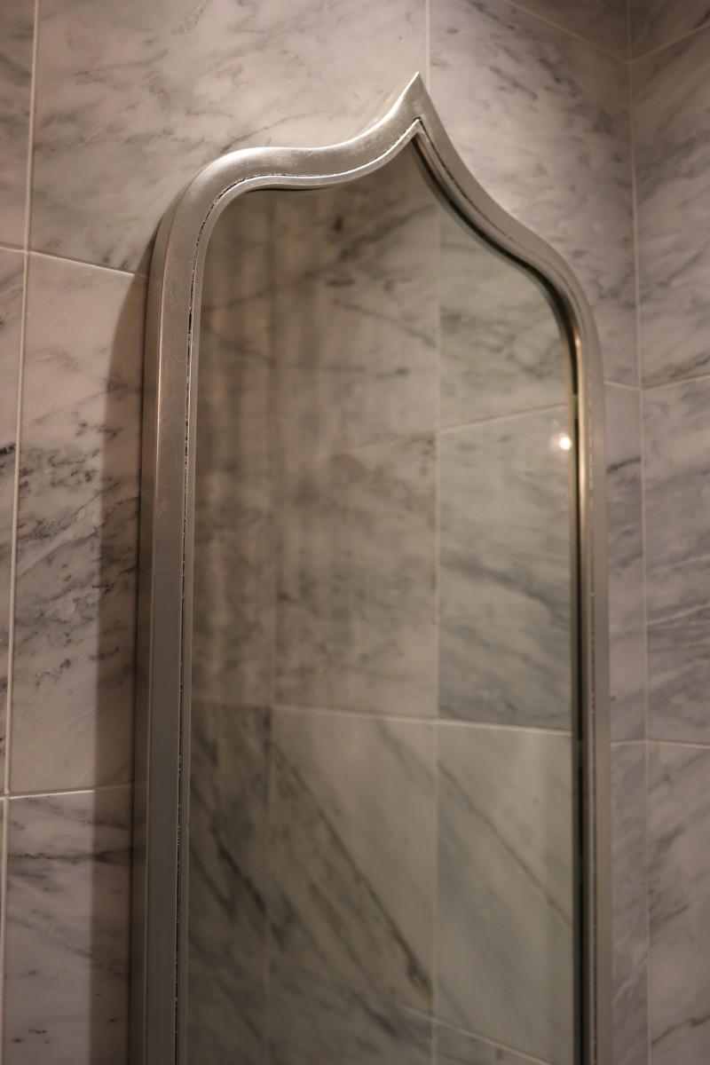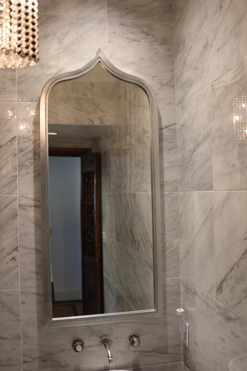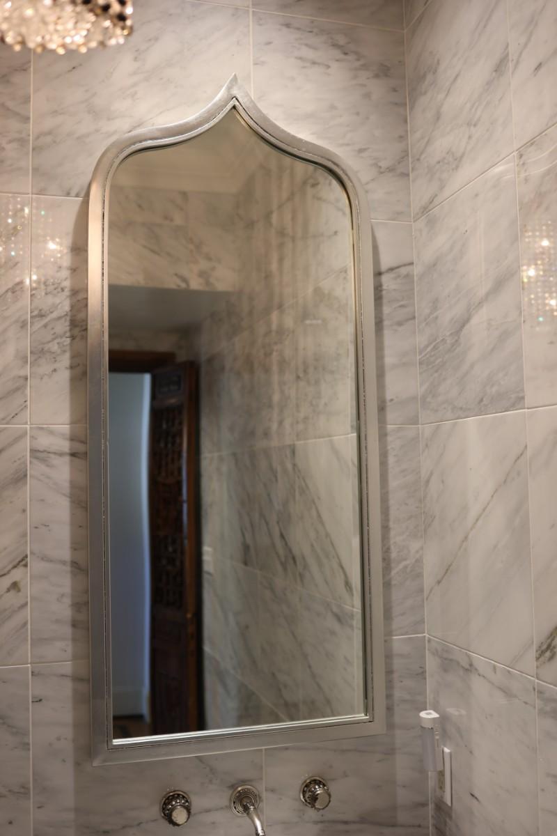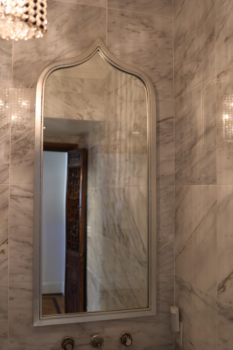 Elegant wall mirror featuring a silver-toned frame and pointed arch top in a Moorish or Moroccan-inspired design. A stylish accent for bathrooms, entryways, or dressing areas.