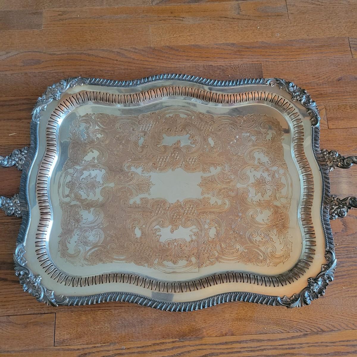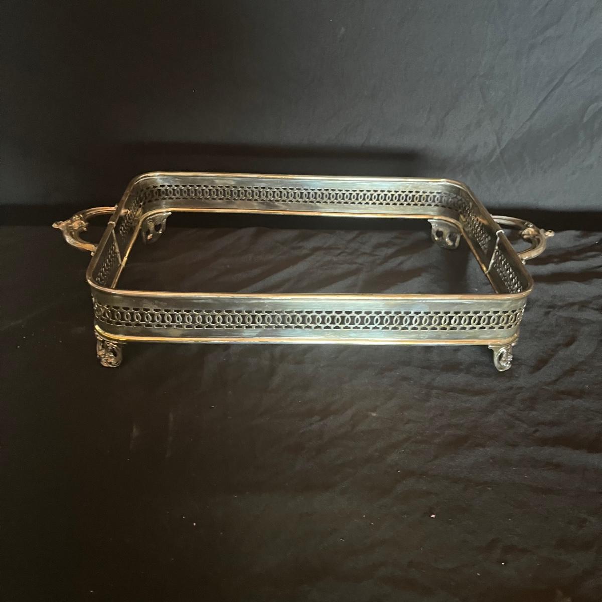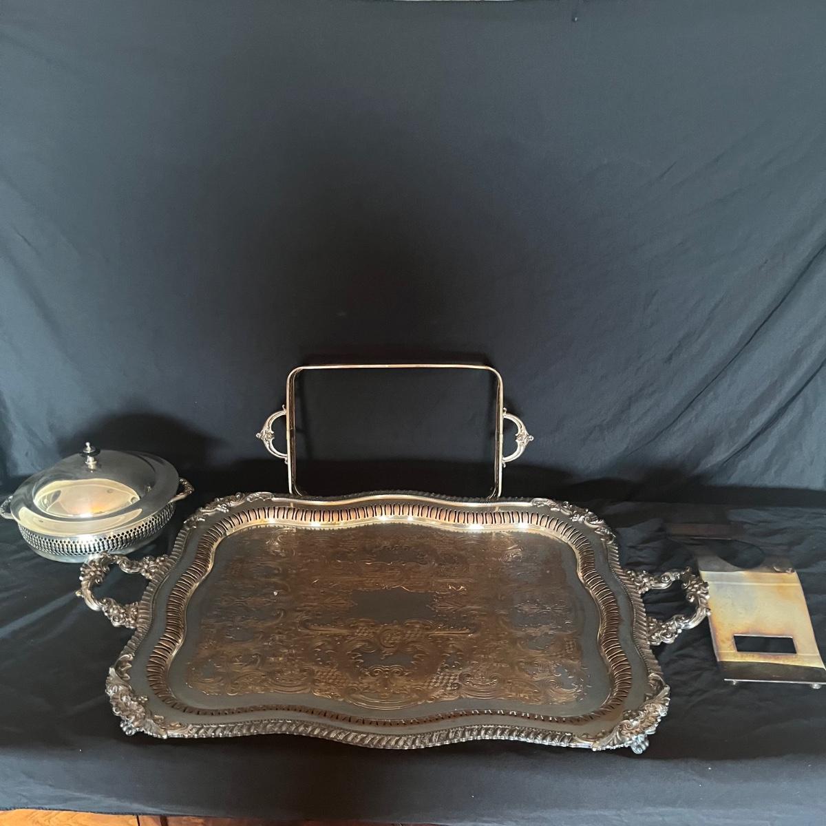 Lot includes a large silver plated serving tray that measures 19” x 30”, a wine bottle holder, casserole dish holder, and dish holder with lid. Both dish holders are missing glass.