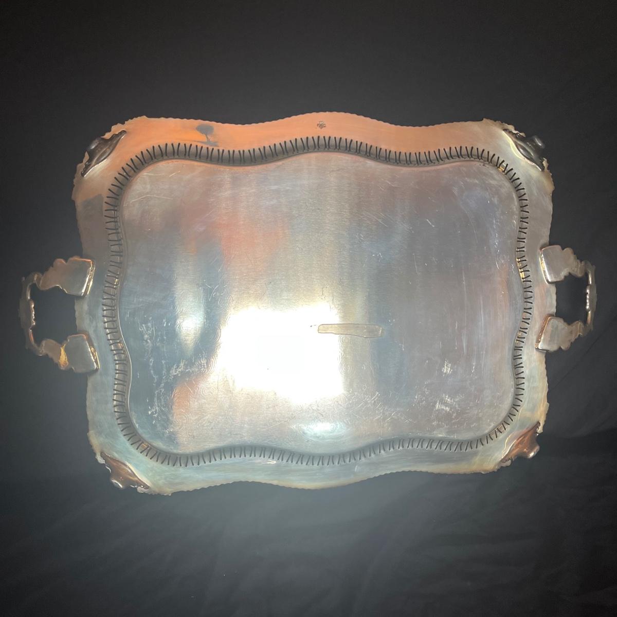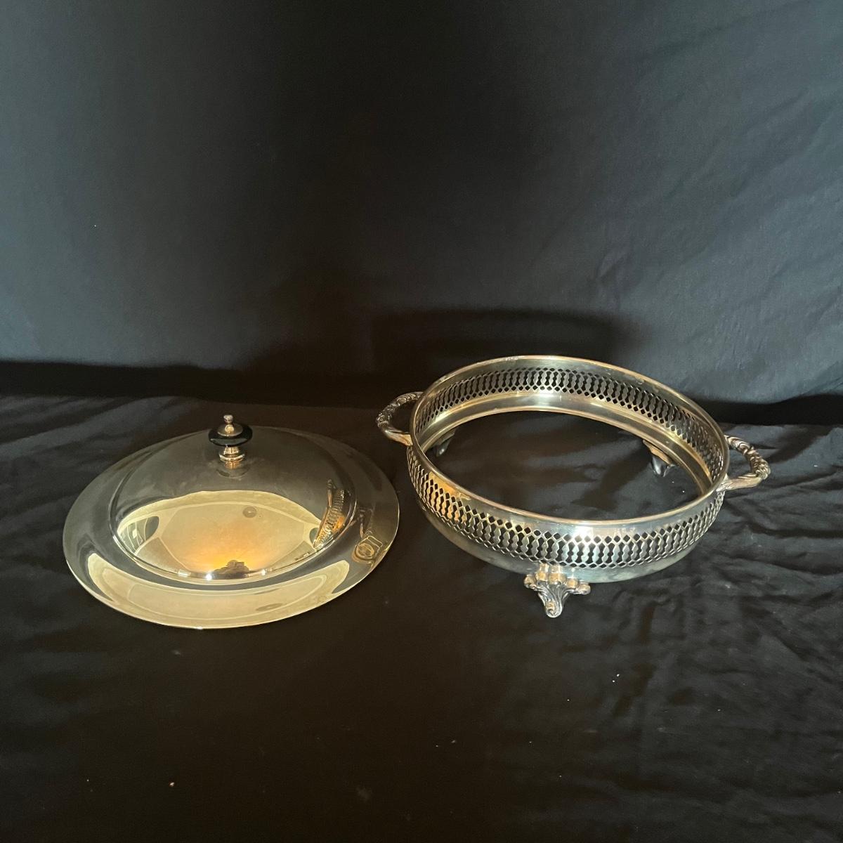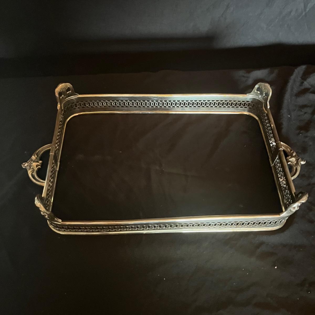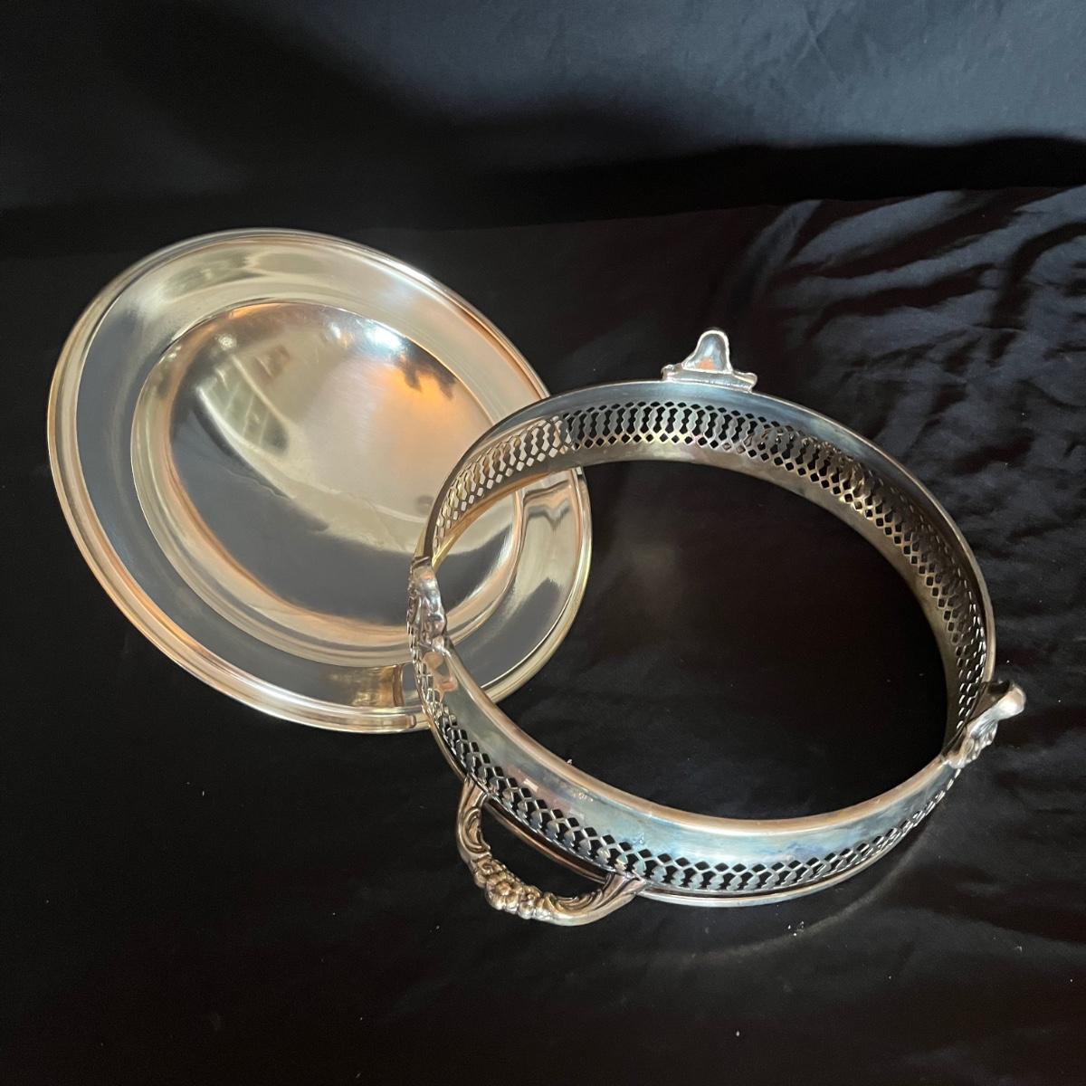 Lot includes a large silver plated serving tray that measures 19” x 30”, a wine bottle holder, casserole dish holder, and dish holder with lid. Both dish holders are missing glass.