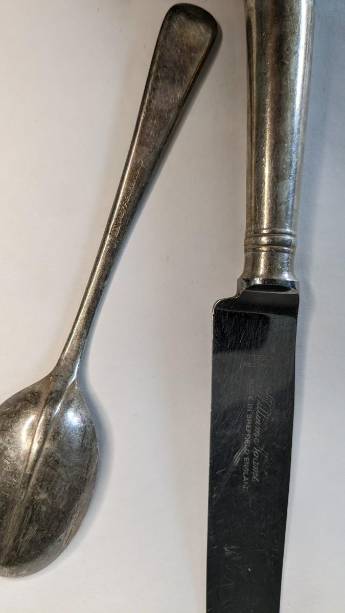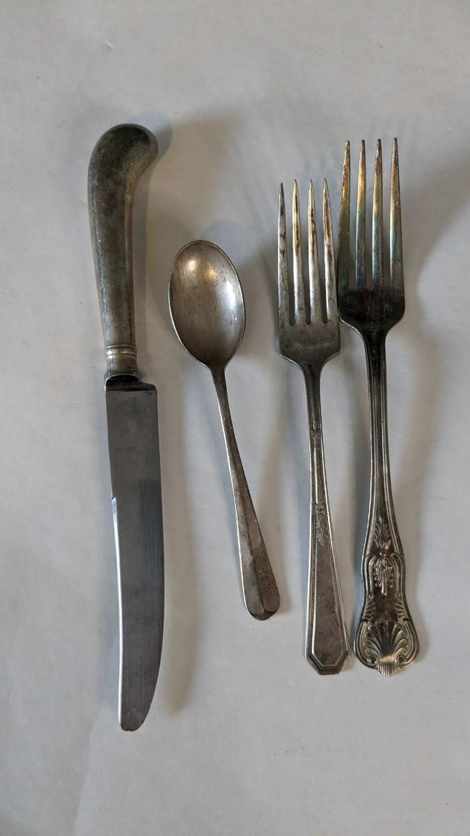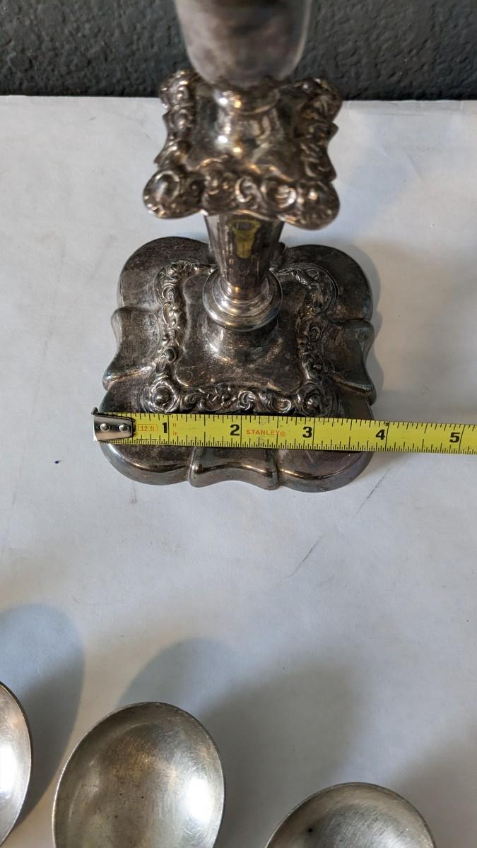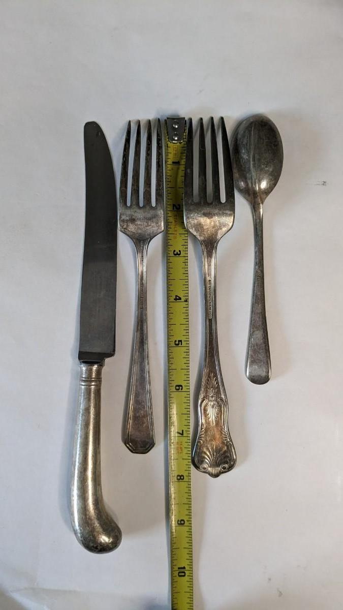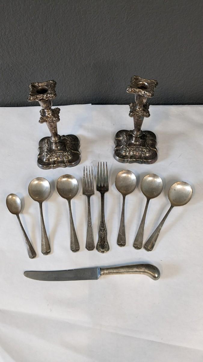 2 candlestick holders, (5) 7" spoons, 2 varied length forks,1 small spoon, and 1 knife.