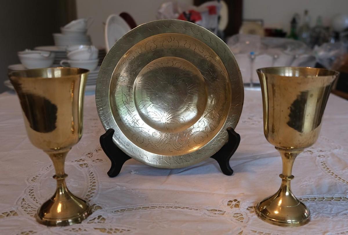Silverplate, 11 pieces. Reed & Barton, Rogers Bros, etc. Plus bonus of three brass items; Two goblets, one shallow bowl