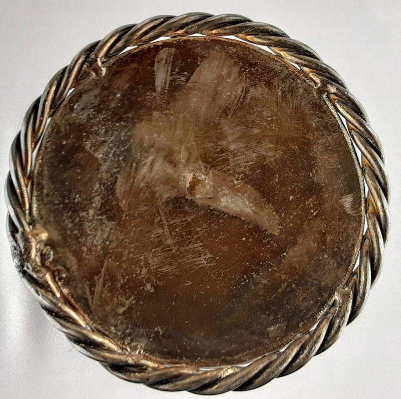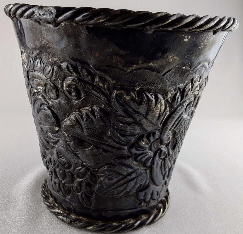 Fancy metal silverplate planter/cache pot that measures 5.5in. tall and 6in. diameter. Needs a little polish to bring out the brilliant silver patina.
