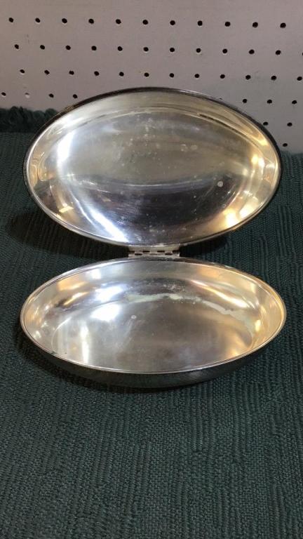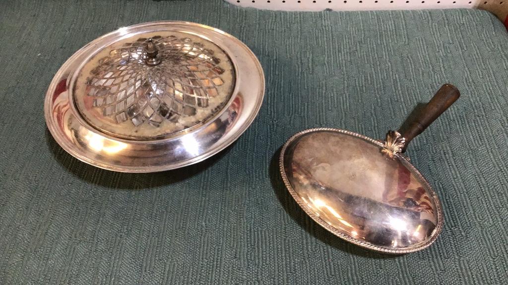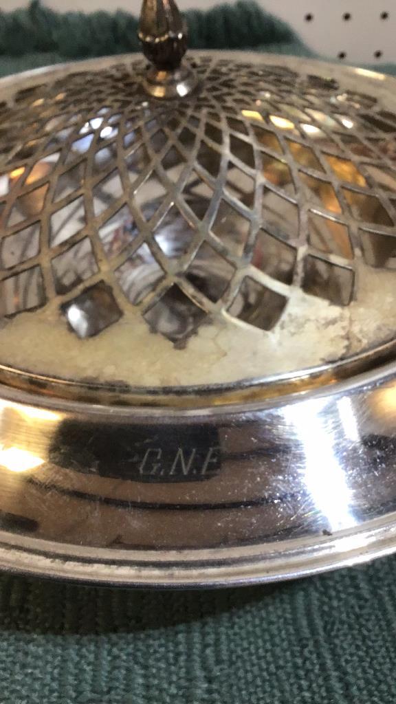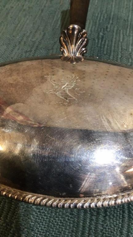 SVP centerpiece with open work lid, monogrammed GNE, illegible mark on bottom..silent butler with wooden handle, Lion with staff on lid