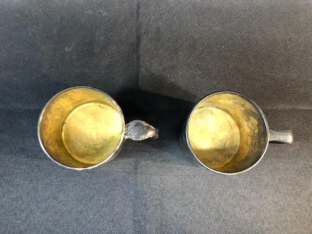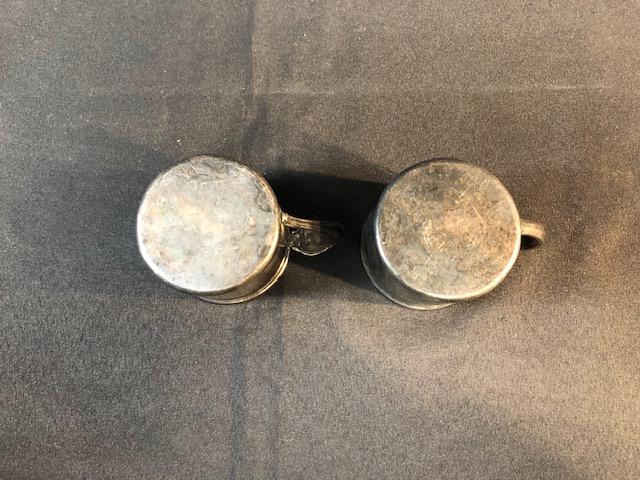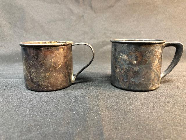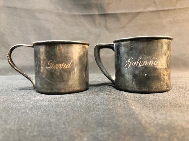 Antique silverplate children's cups. Engraved, one belonged to David, the other Johnnie. Badly tarnished. David cup has a handle that looks like it was made from a piece of flatware.