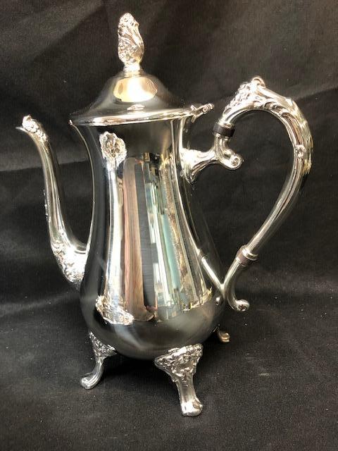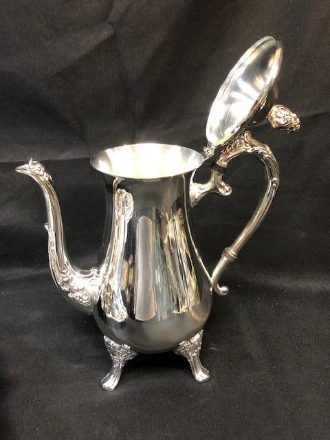 Silverplate Service Set. Includes Tea Pot with matching cream and sugar, serving tray, set of 4 napkin rings and serving tongs. The tray is made by Kent. The tings are Sheffield. The tea pot is Alvin. Good Condition.