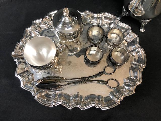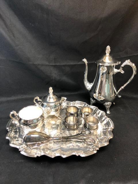 Silverplate Service Set Tea Pot Cream & Sugar Platter Napkin Rings Tongs