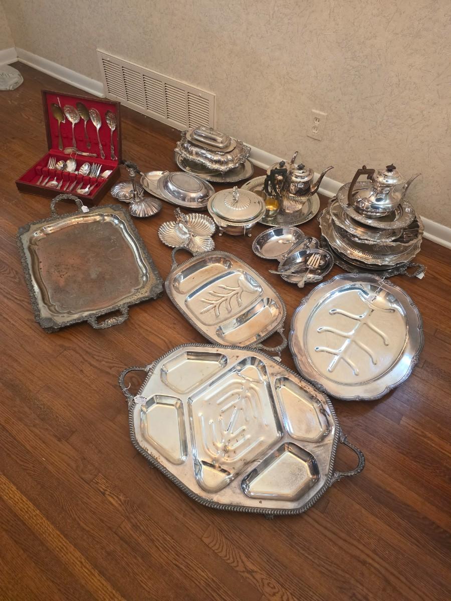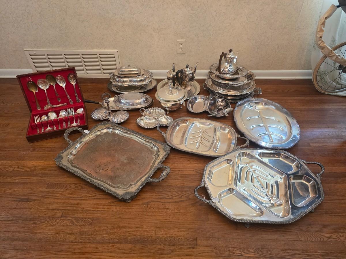 Lot of silverplate trays and serving pieces. It is all silverplate, no sterling silver. Must take entire lot.