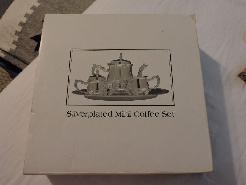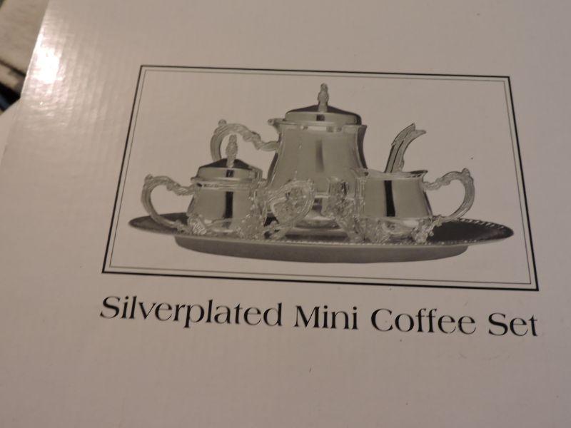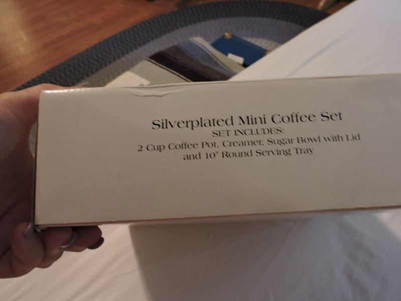 Silverplated mini coffee set, still in box. **Please read Terms and Conditions before placing a bid. Pick up is Sunday, September 15, 2019 from 11am to 4pm and Tuesday, September 17 from 4pm-7pm in Sicklerville. All sales are final. All sales are as is, where is. Please review all photos. Any props included in photos are not included in listing. All measurements are approximate.
