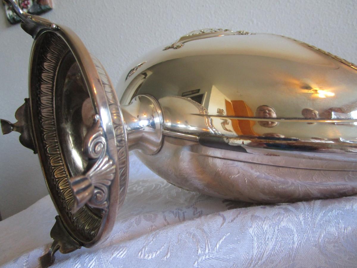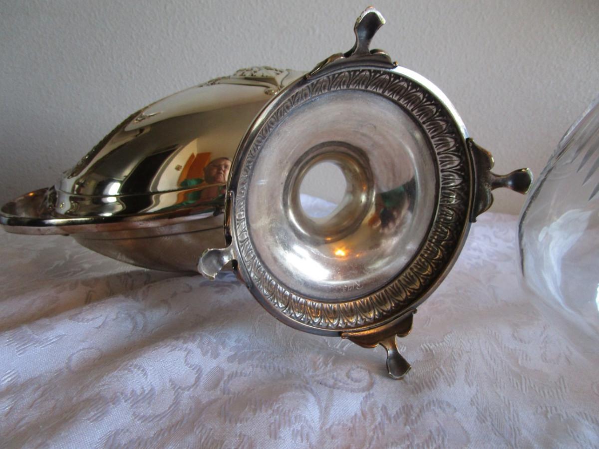 Silver-plated serving piece R173 with feet 9" tall x 15-1/2" handle to handle, insert is glass