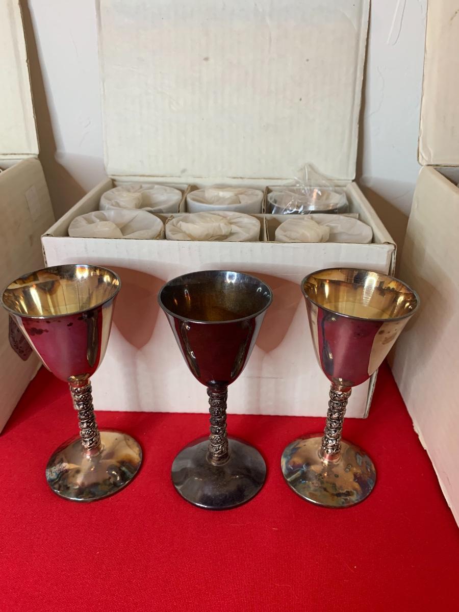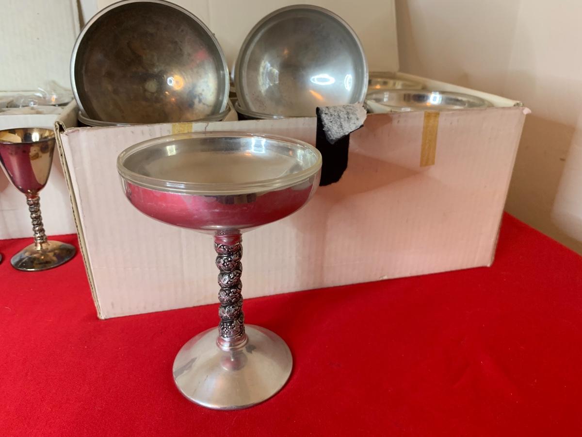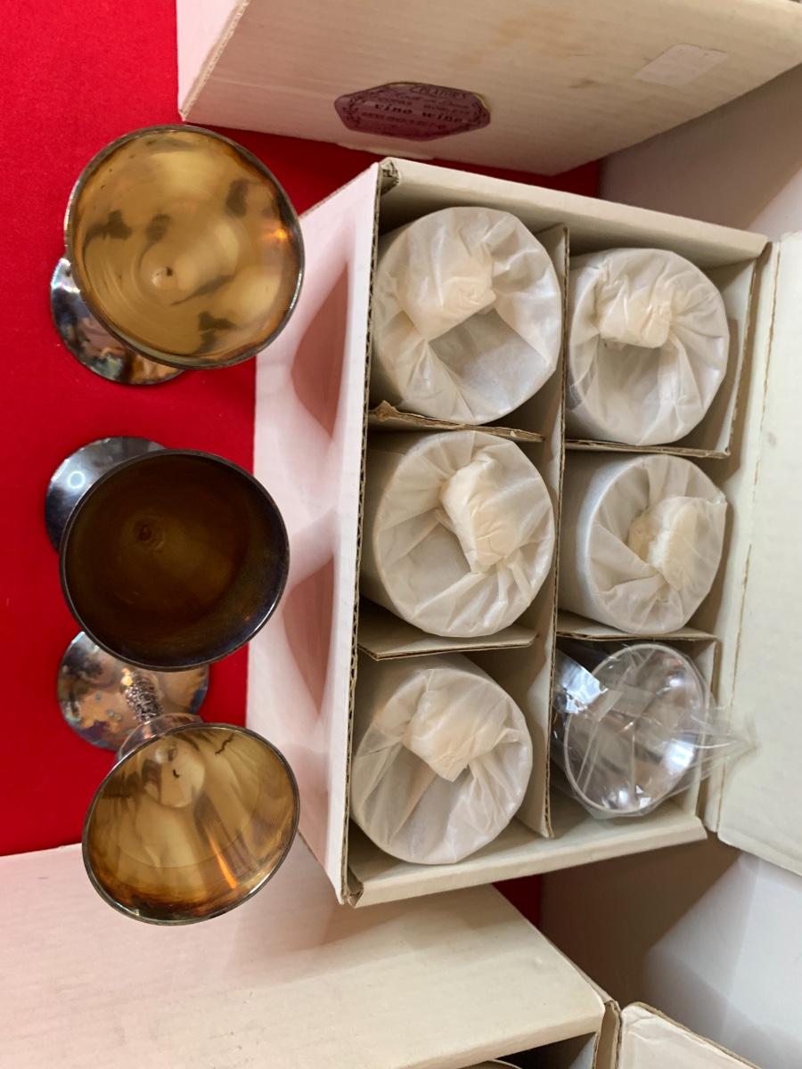 Plator (Spain) Silverstone champagne with liners (9), cordials (9), water goblets (9) and vino/wine (6). Ones in the boxes are in perfect condition the ones that were unwrapped have tarnish.