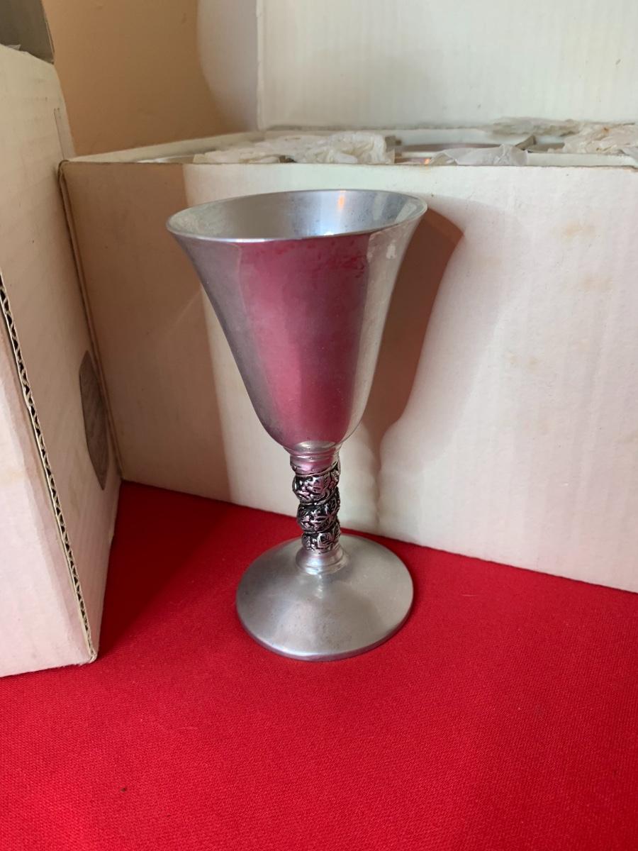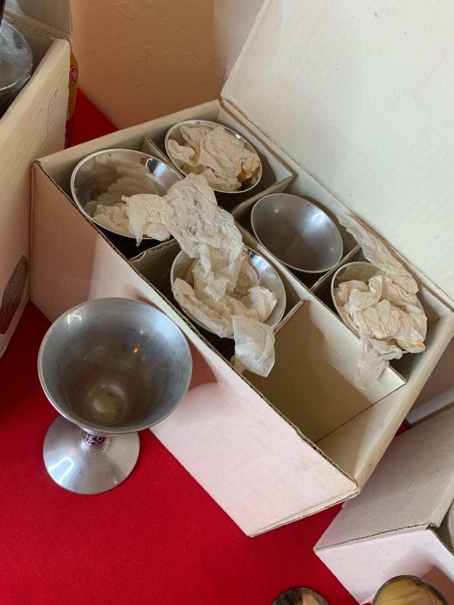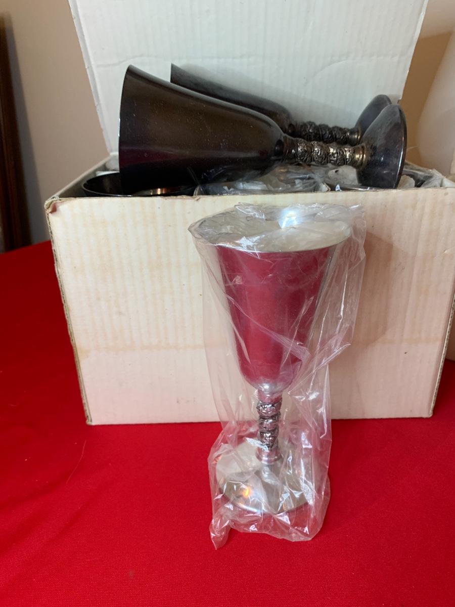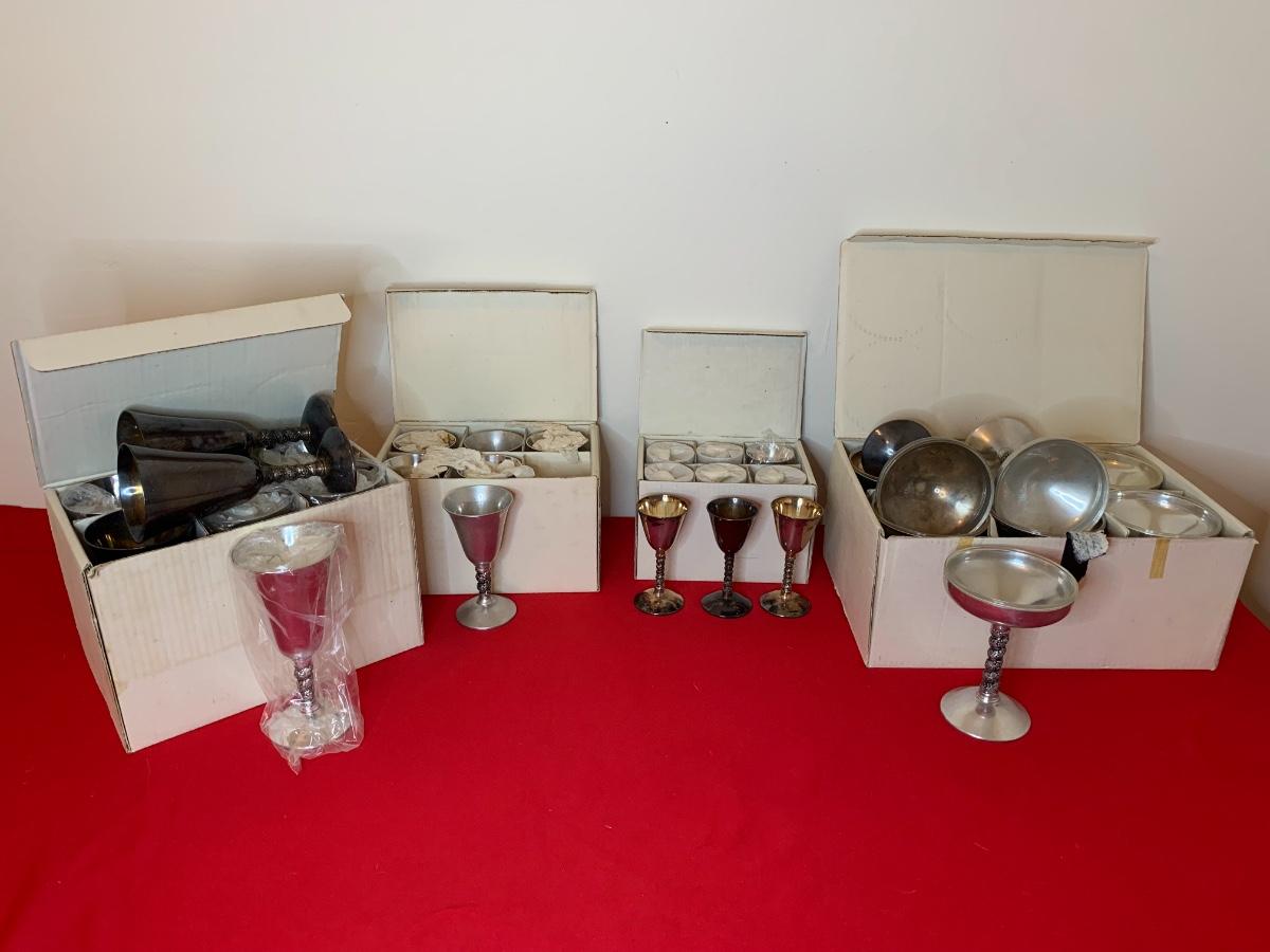 Plator (Spain) Silverstone champagne with liners (9), cordials (9), water goblets (9) and vino/wine (6). Ones in the boxes are in perfect condition the ones that were unwrapped have tarnish.